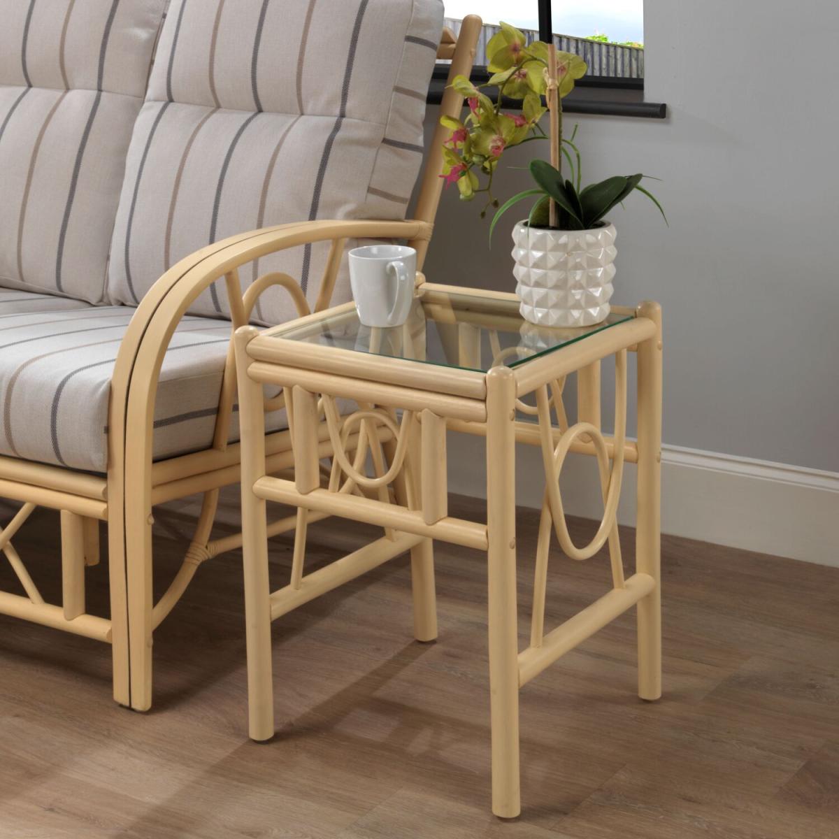 A sustainable natural rattan lamp table with 5mm toughened glass top and double pole frame structure