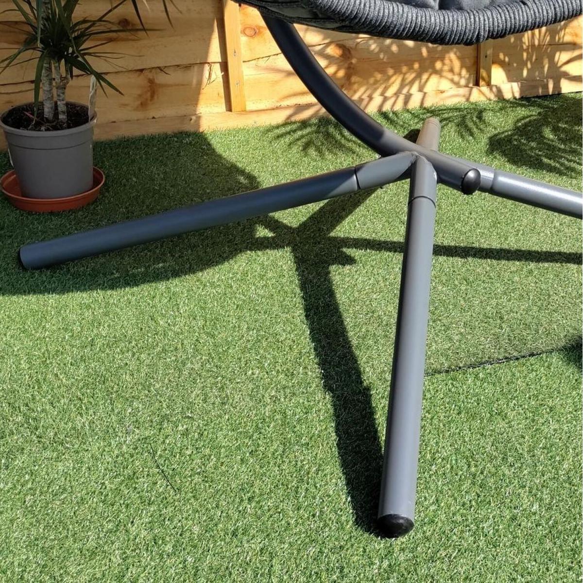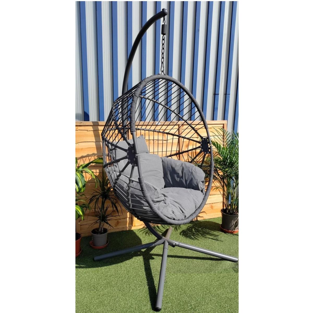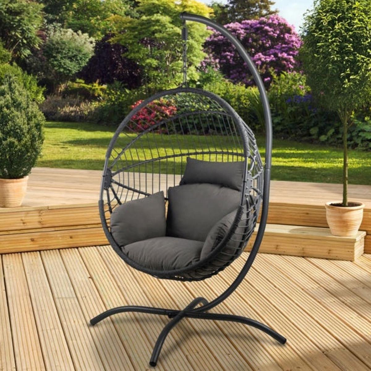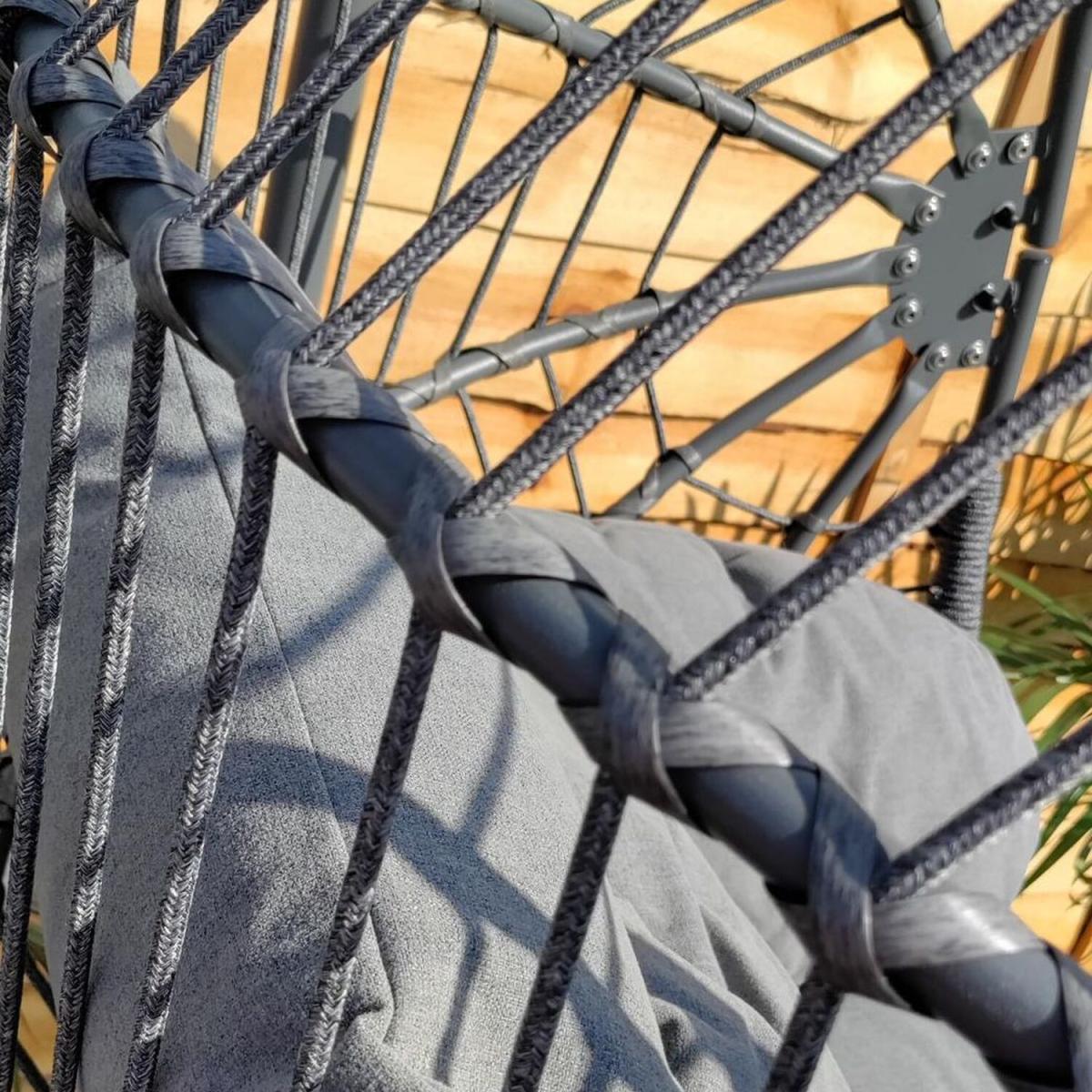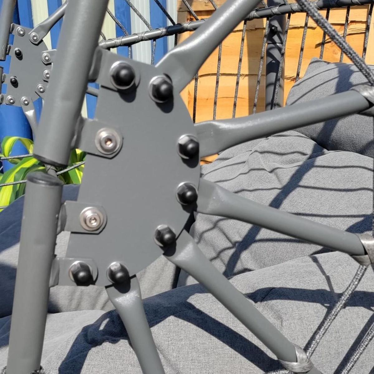 Relax & unwind in supreme comfort with this deluxe Bali Hanging Swing Egg Chair. Suited for both indoor & outdoor use, this freestanding hanging chair features a cocoon-shaped hammock seat complete with an extra thick padded cushion and head rest for extra comfort. The grey powder-coated steel collapsible frame structure enables easy storage all year around, and the hand-woven synthetic rattan ensures low maintenance is needed providing elegance and comfort throughout the year. Designed for single person use with a maximum weight capacity of 120kg. Measuring (base) 134cm x 205cm (basket) 120cm x 97cm x 68cm, provides a generous sized relaxer chair Ideal for any garden or patio area, conservatory, bedroom or even a home living room. Just sit back and let the soothing gentle swinging motion help you to relax in style. Assembly is required but everything you need is included to help you get set up and unwind in no time at all! Two-man lift advised as boxed weight is approximately 27kg.