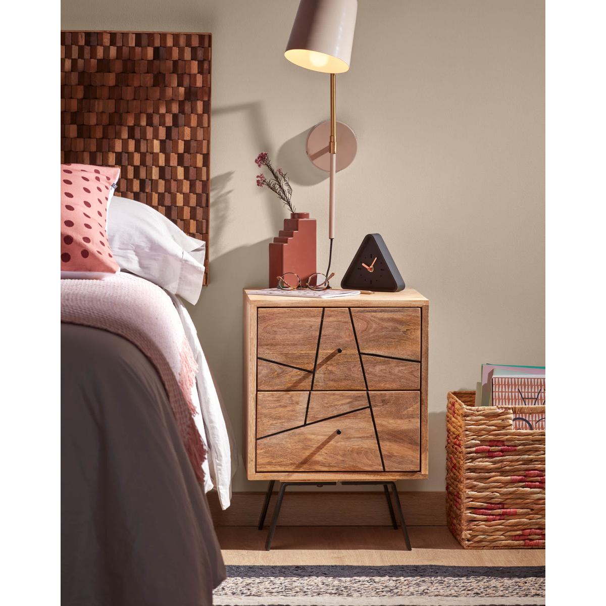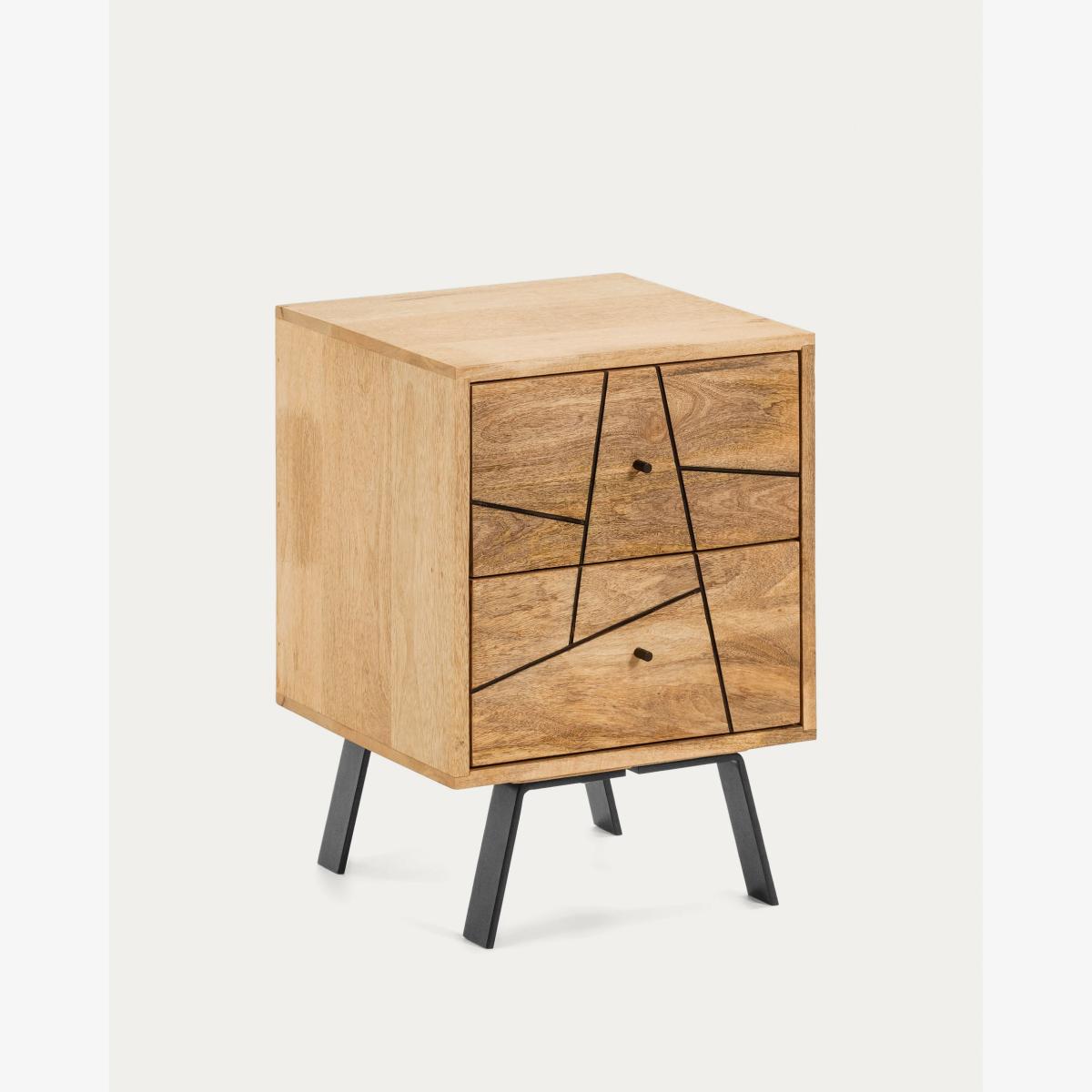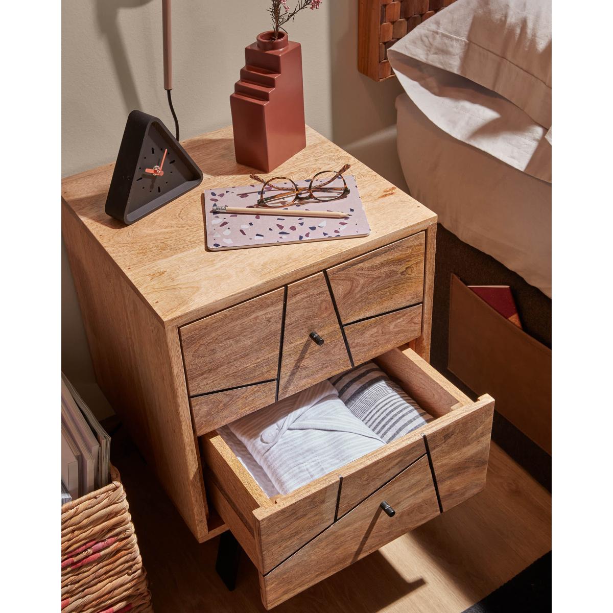 The structure of the Balia bedside table is made of solid natural mango wood. It is handmade, including decorative metal details embedded in the drawers. The legs are also made of metal and have the same matt black finish. Each Balia beside table is unique thanks to the grain of the wood. If you wanted an exclusive piece of furniture, you've found it.
