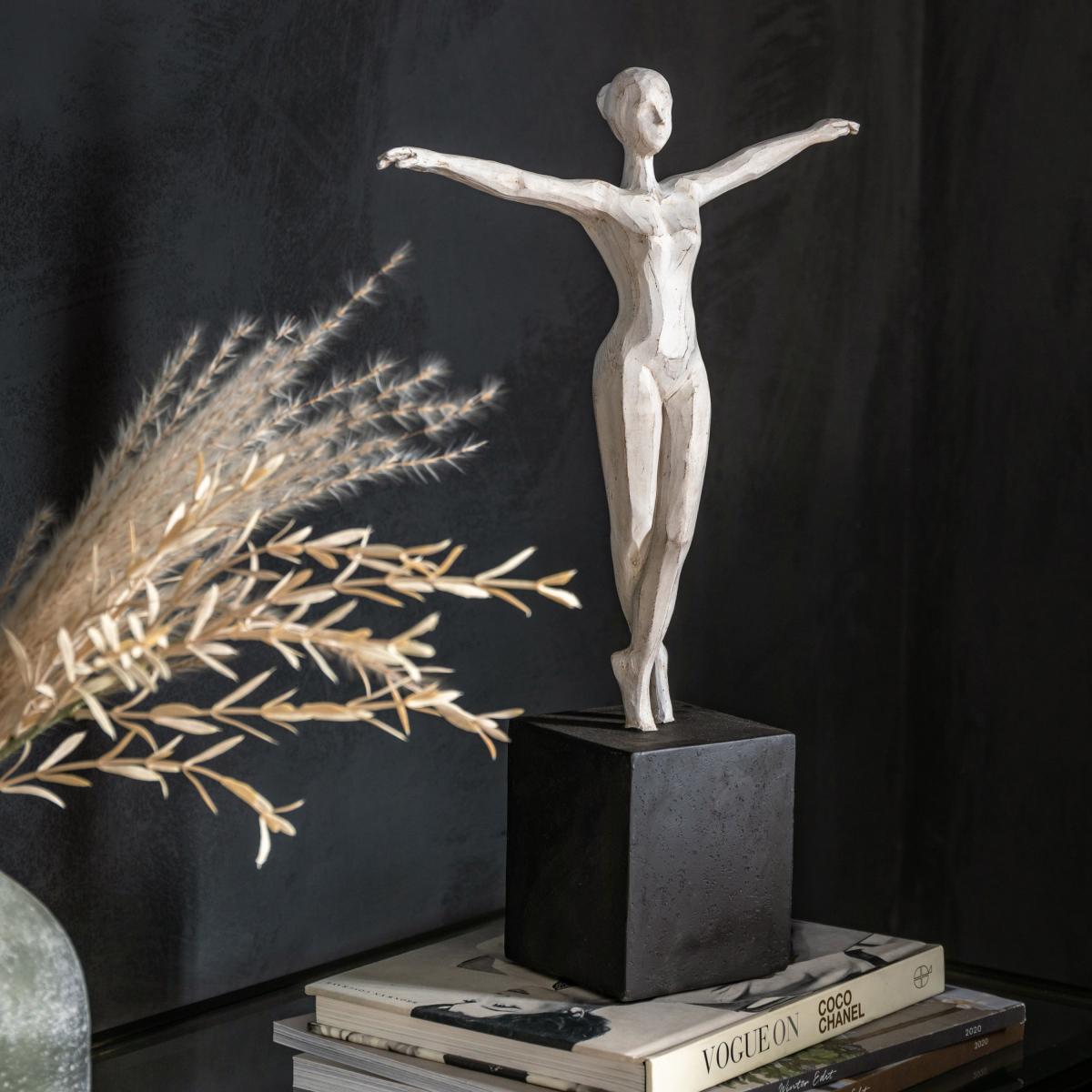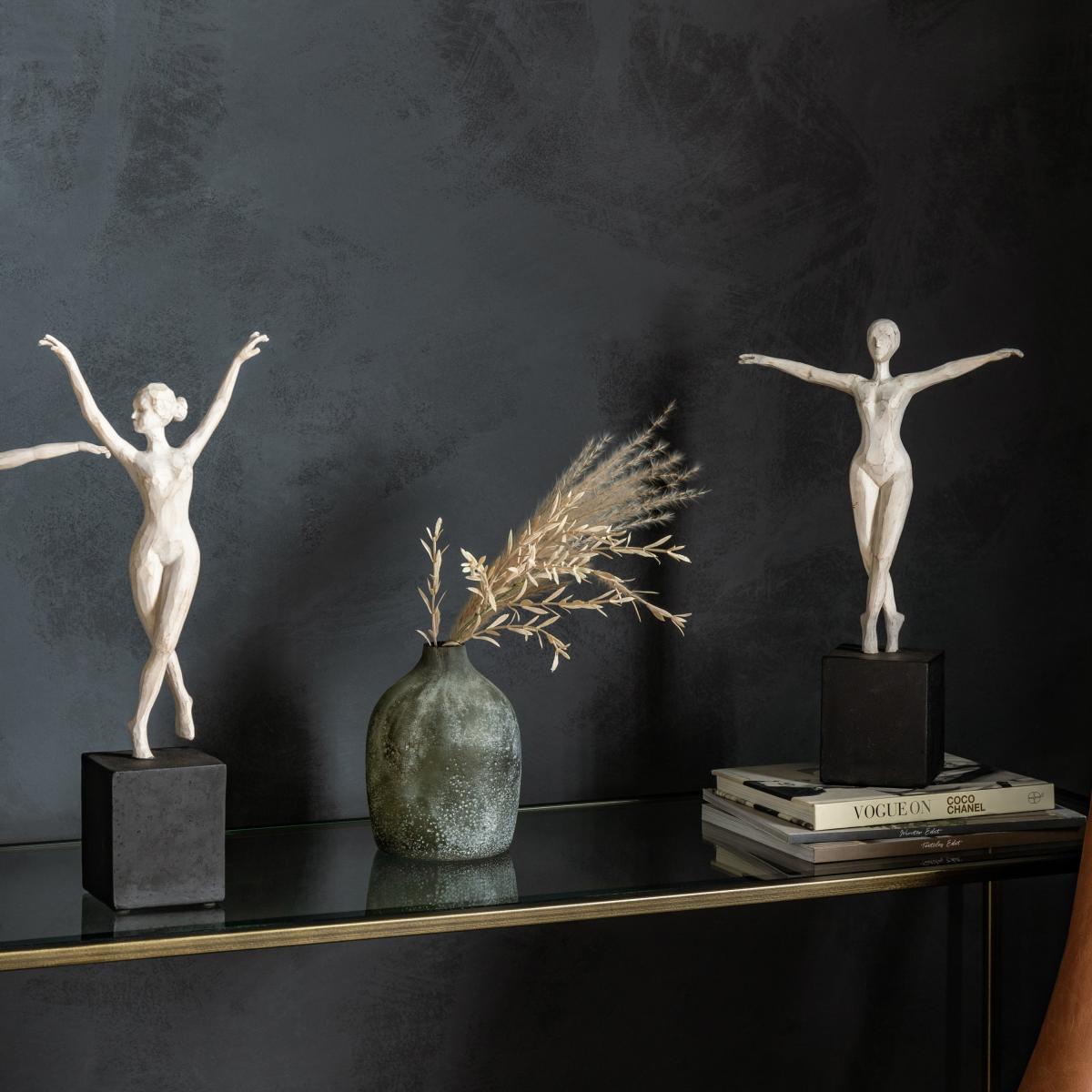 I love this ballet-inspired sculpture for its graceful yet modern form. It works particularly well in contemporary or minimalist interiors, where its clean lines can be a focal point without overwhelming the space. It’s versatile enough to sit on a side table, mantelpiece, or even a console in an entryway, adding an artistic and sophisticated touch. For styling, consider pairing it with sleek monochrome furniture or placing it against a neutral wall to let the sculpture stand out. A well-lit space enhances the contours and delicate stance of the dancer, making it a striking yet understated piece that adds personality to your decor.