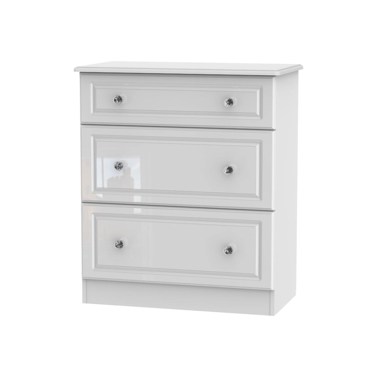 With its narrow drawer and two deep drawers, this chic and contemporary Balmoral Three Drawer Deep White Gloss Chest is a versatile and spacious storage solution for your bedroom. Finished in a high quality white gloss with smart drawer panelling and stunning crystal effect handles, these drawers will beautifully complement your interior aesthetics. Use the top drawer to hold small accessories, cosmetics or undergarments, while the bottom drawers have ample space for bedding, towels and electronics. Its glossy top panel can be decorated with art, bouquets or ornaments to finish off this timeless piece and make it your own.