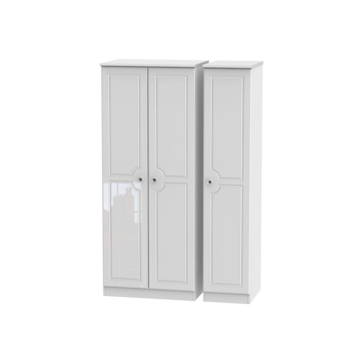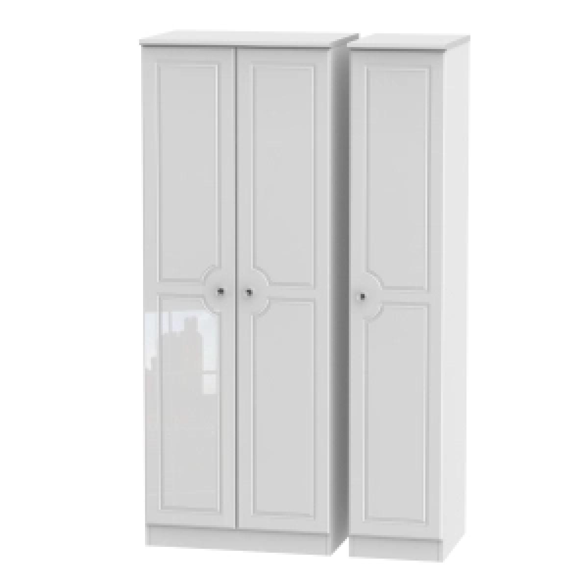 Featuring a smart white gloss finish and elegant panelled detail, this contemporary Balmoral Triple Plain Wardrobe with Crystal Effect Handles is the ideal solution for all your bedroom storage needs. Featuring two spacious compartments, this wardrobe provides you with ample space for all your clothes and accessories. Keep garments crease free on either of the two full width hang rails and store shoes, bags and other accessories on one of the two shelves. Adorned with stunning crystal effect handles, this piece will beautifully catch and reflect the light, complementing your existing style while adding just a touch of sparkle to your room. It is available in two sizes to suit your needs and room size.