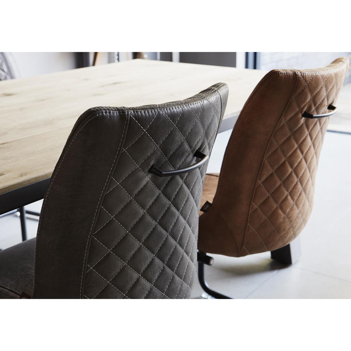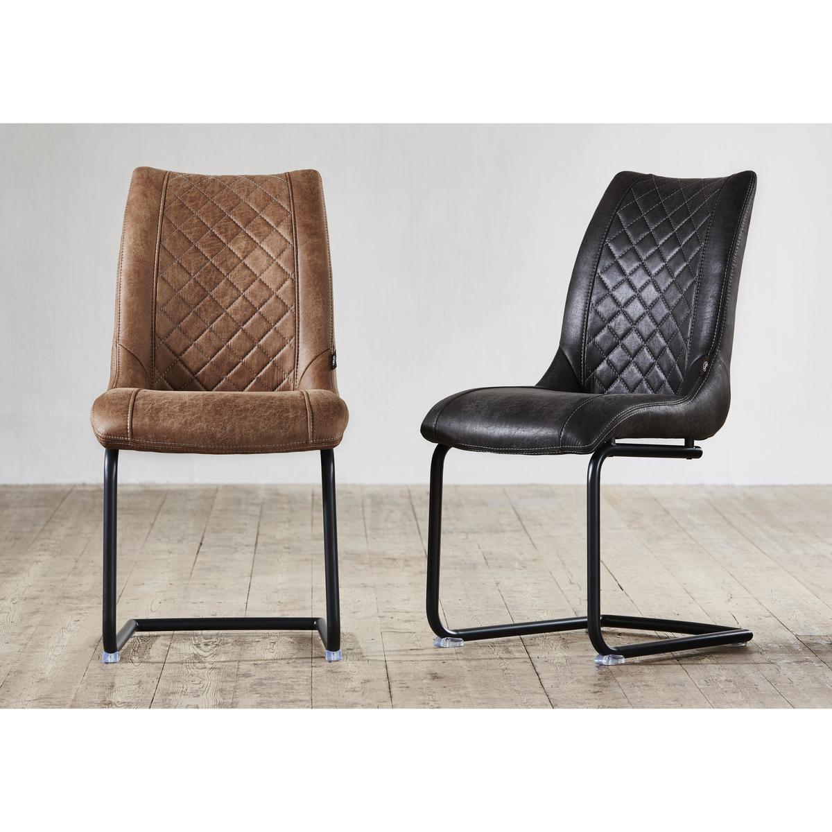 If you prefer the sleeker side of industrial style, then the Baltimore collection is for you. Beautifully crafted from a seamless blend of rustic oak veneers and dark grey metal accents, this extensive range features some very cool design details – wooden planked surfaces, tops that appear to float, soft-close cupboard doors and drawers with elongated handles, and display alcoves with LED lighting. Offering a wide range of storage pieces – there are four sizes of sideboard as well as a dresser, display cabinet, TV unit and more – this on trend range also includes three sizes of dining table, a dining chair and dining sets. Exclusively available at Furniture Village. The cool retro-style Baltimore dining chair cocoons your dinner guests in relaxed comfort, thanks to the beautifully curved seat and cantilever-style base in off-black powder-coated metal. Wonderfully well cushioned and fully upholstered in hardwearing faux leather in your choice of warm cognac or fashionable anthracite, chairs feature decorative stitching in a diamond pattern. The Baltimore dining chair is part of the industrial-style Baltimore range and is designed to complement the rustic oak veneer and dark grey metal Baltimore dining table, available in three sizes.