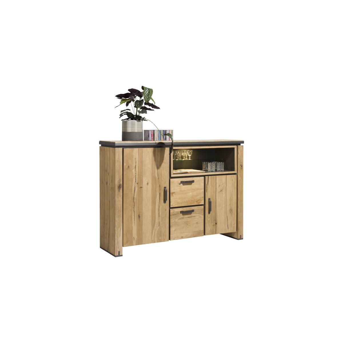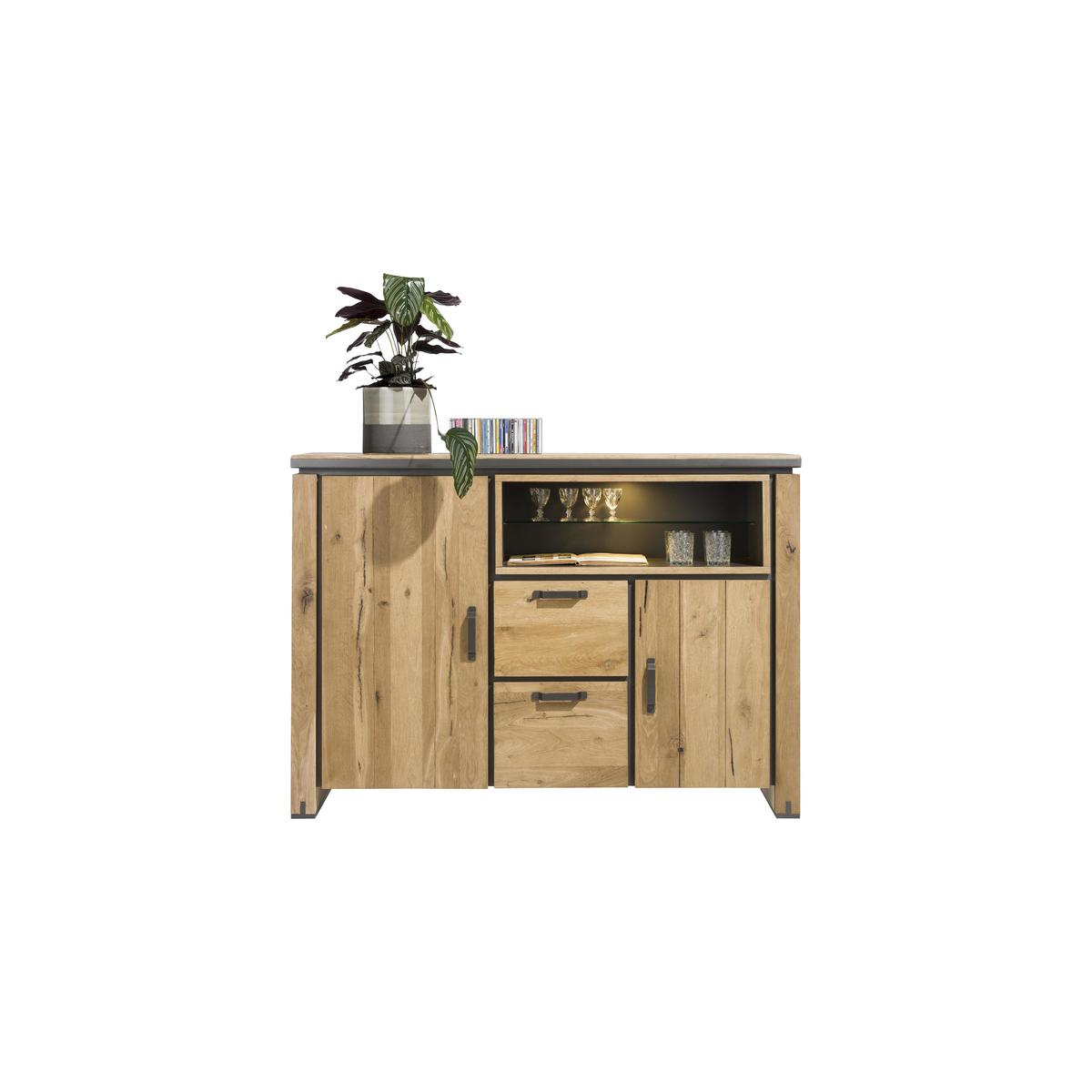 Spacious storage? Tick. A combination of open and closed spaces? Tick. Cool industrial style with precise details? Tick again. The Baltimore sideboard really does have it all. With its beautiful rustic oak veneer finish combined with dark grey metal accents, its a stylish interpretation of the modern industrial look. And the details are superb. The oak veneer top has an interesting planked appearance, and the metal accents from the door and drawer handles to the metal strip which underpins the floating top to the inset detail in the feet are beautifully finished. This piece has two soft- close drawers, and the two spacious soft- close cupboards each have a fixed shelf, making it the perfect drinks cabinet or games cupboard. The alcove is perfect for displaying favourite pieces and has a glass shelf and built in LED lighting. The Baltimore wide dresser is part of the Baltimore range. Only at Furniture Village. Did you know? Natural wood has unique markings, with some colour variation. The colour and tone of wood improves with age. WARNING! Furniture can tip over unexpectedly and cause injury. This item must be fixed to a wall using the anti- tip kit provided. Be sure to use the correct wall fixings suitable for the walls in your home. Furniture Village is not able to fix anti- tip devices for you. Seek professional advice if you are unsure.
