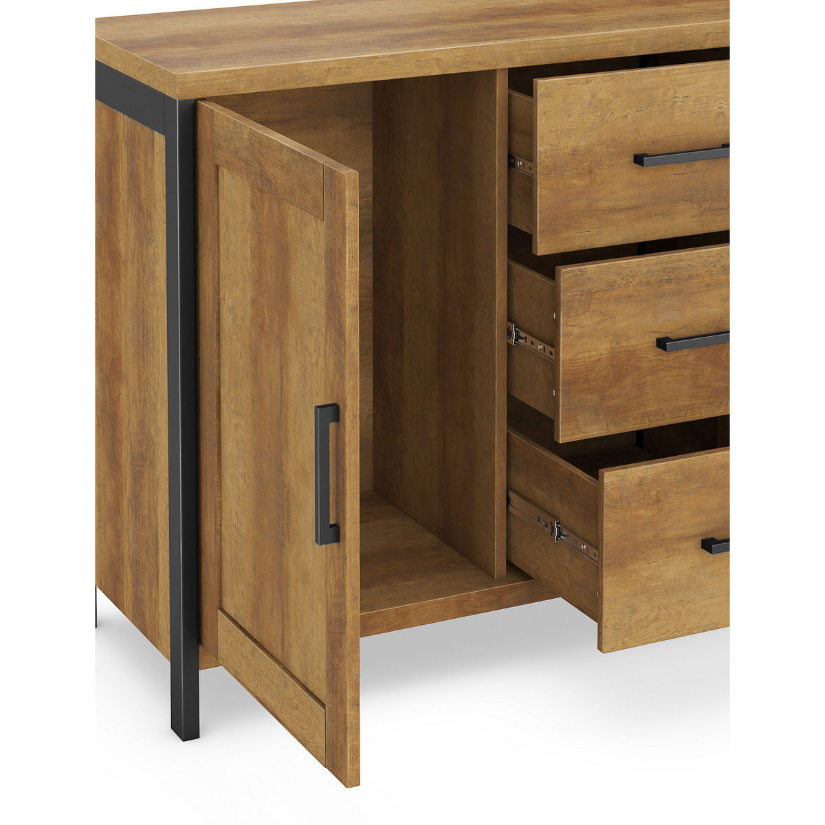 Perfect for storing away all the clutter, board games, books, and other bits and bobs, this Baltimore sideboard has plenty of space and a unique look and feel that will introduce a touch of industrial style to lift the look of your living space. Our adjustable shelf sideboard offers convenient storage, and is made with sustainably sourced materials with a wood-effect finish that's finished with dark metalwork sides and handles. We're so confident our furniture is built to last, our industry-leading guarantee covers any manufacturing failure on all furniture. That's our promise, and why our furniture comes with a 10-year guarantee that you can trust. Excludes: outdoor furniture and any issues that are a result of normal wear and tear, improper care or accidental damage.