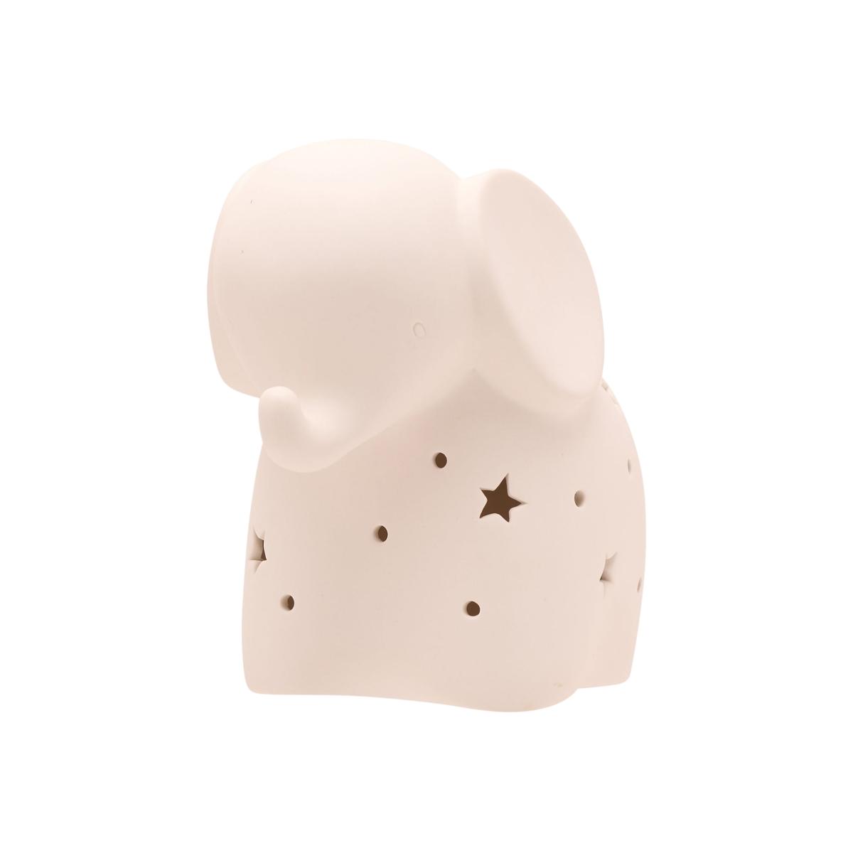 * Ceramic night light* Elephant shaped* Gentle illumination* Star and circle pattern* Battery operated Create a magical atmosphere with this playful elephant shaped night light from BAMBINO BY JULIANA. Meticulously crafted in ceramic, the star and circle perforations create an enchanting pattern in the space. An effortless mix of function and beautiful design, this night light will enhance any space and make bedtime a pleasure.