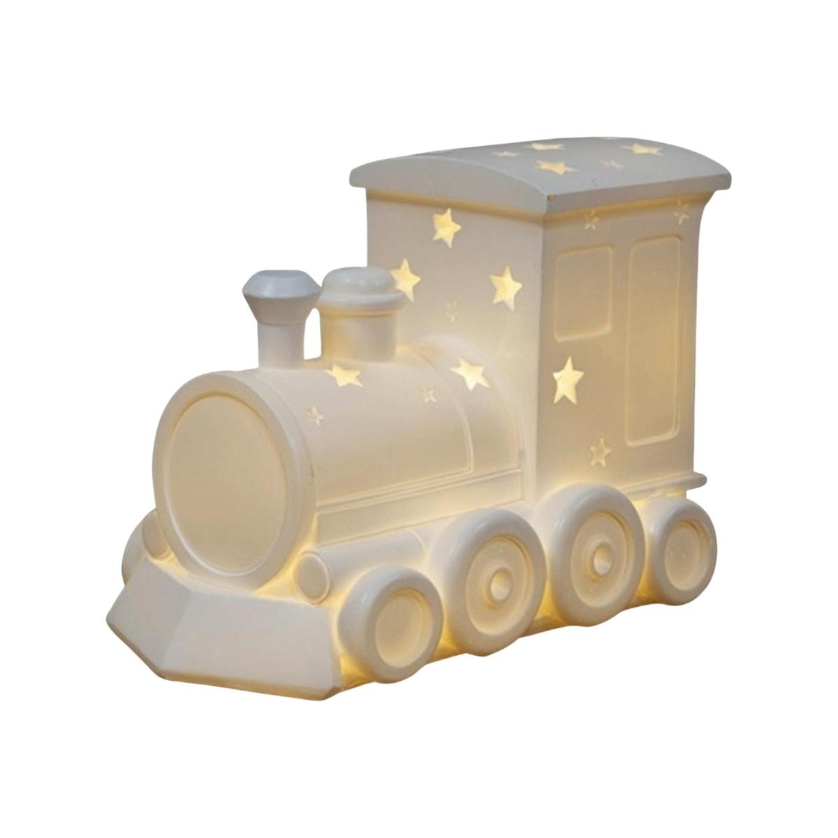 * Battery powered light * Hand painted clay * Warm yellow glow Add a sprinkle of charm to their bedtime with this delightful battery-powered train night light. Hand-painted in soft grey and white with twinkly crystals for wheels and star-shaped cut-outs that let a gentle warm glow shine through, it’s perfect for creating a calm and comforting space.
