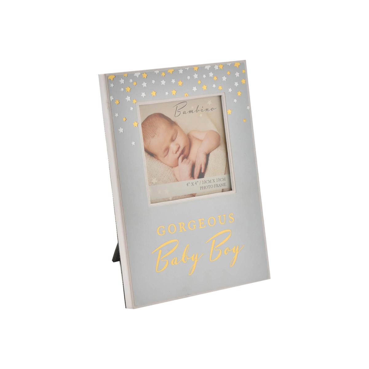 * Perfect as a gift for a loved one* Freestanding frame* Single photo frame A paper wrap photo frame from BAMBINO BY JULIANA. This adorable frame is the perfect way to beautifully present the photograph of a new born son. The freestanding, blue paper wrap frame features a ‘Gorgeous Baby Boy’ gold decal. It is completed by a square aperture which is surrounded by gold and silver star decoration. The frame is packaged in a branded closed box.