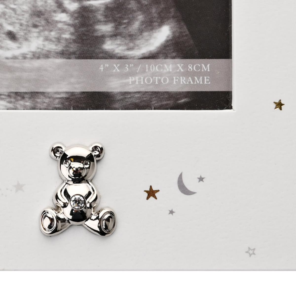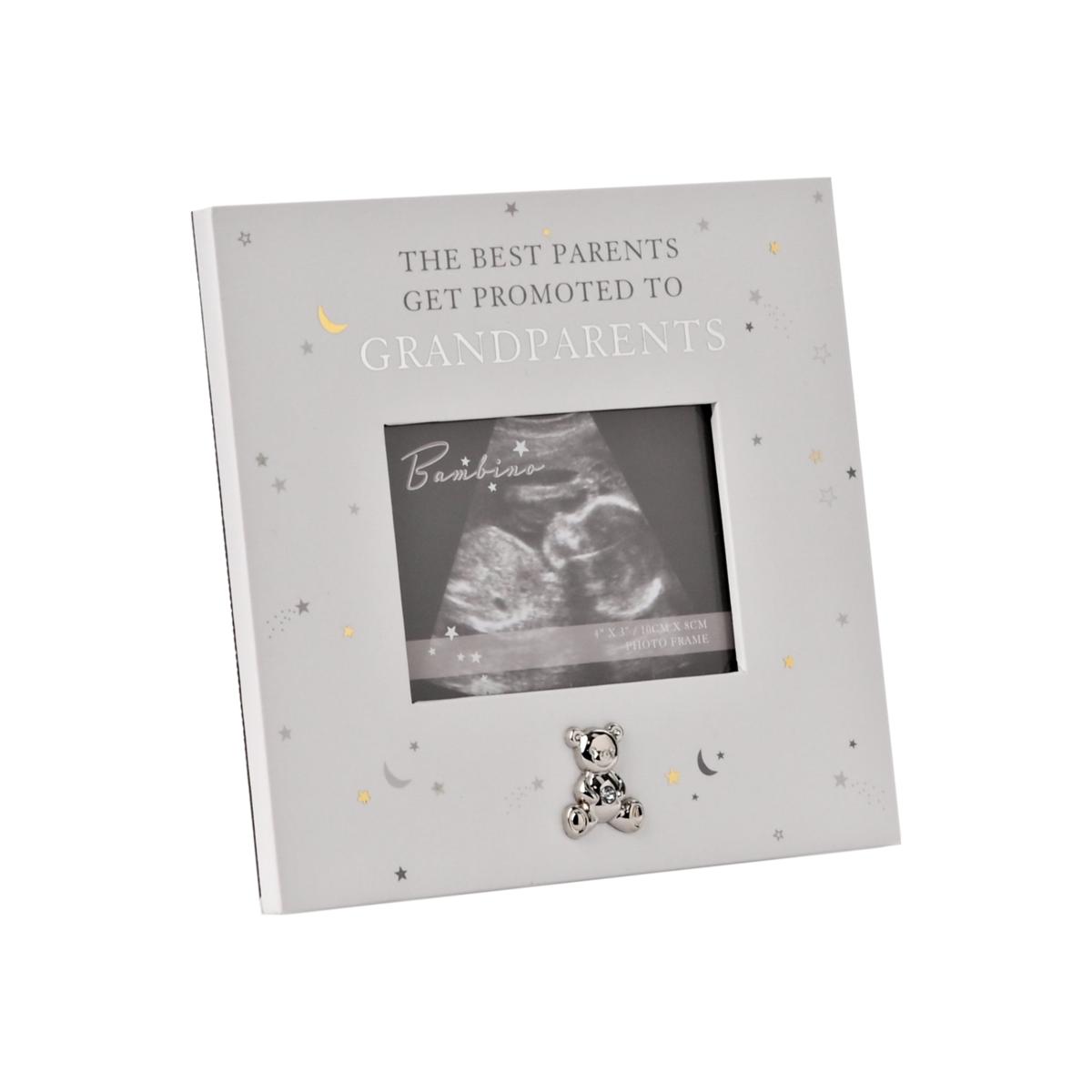 * Perfect as a gift for a loved one* Freestanding frame* Single photo frame A grandparents scan frame from BAMBINO BY JULIANA. This affectionately personalised frame is a heart-warming gift for grandparents-to-be. The freestanding, white wooden frame features a rectangular aperture designed specifically for baby scan photos. It is finished with ‘starry night’ decoration, crystal set silver plated teddy bear icon and complementary ‘The Best Parents Get Promoted to Grandparents’ decal. The frame is packaged in a branded closed box.