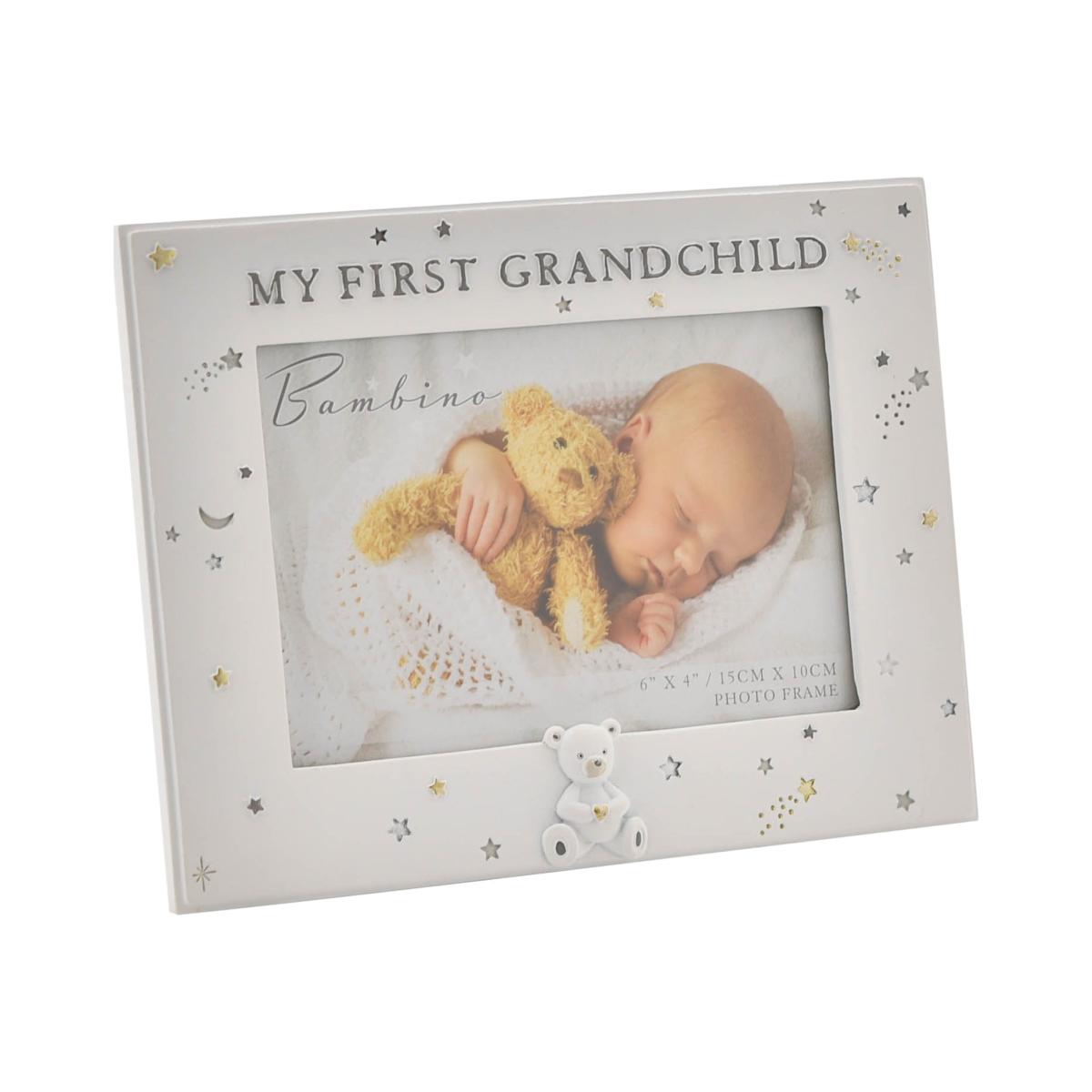 * Perfect as a gift for a loved one* Freestanding frame* Single photo frame A First Grandchild photo frame from BAMBINO BY JULIANA. This affectionately personalised frame is a heart-warming gift for new grandparents. The freestanding, white resin frame features a landscape aperture. It is finished with hand painted ‘starry night’ decoration, adorable white teddy bear icon and complementary ‘My First Grandchild’ decal. The frame is packaged in a branded closed box.