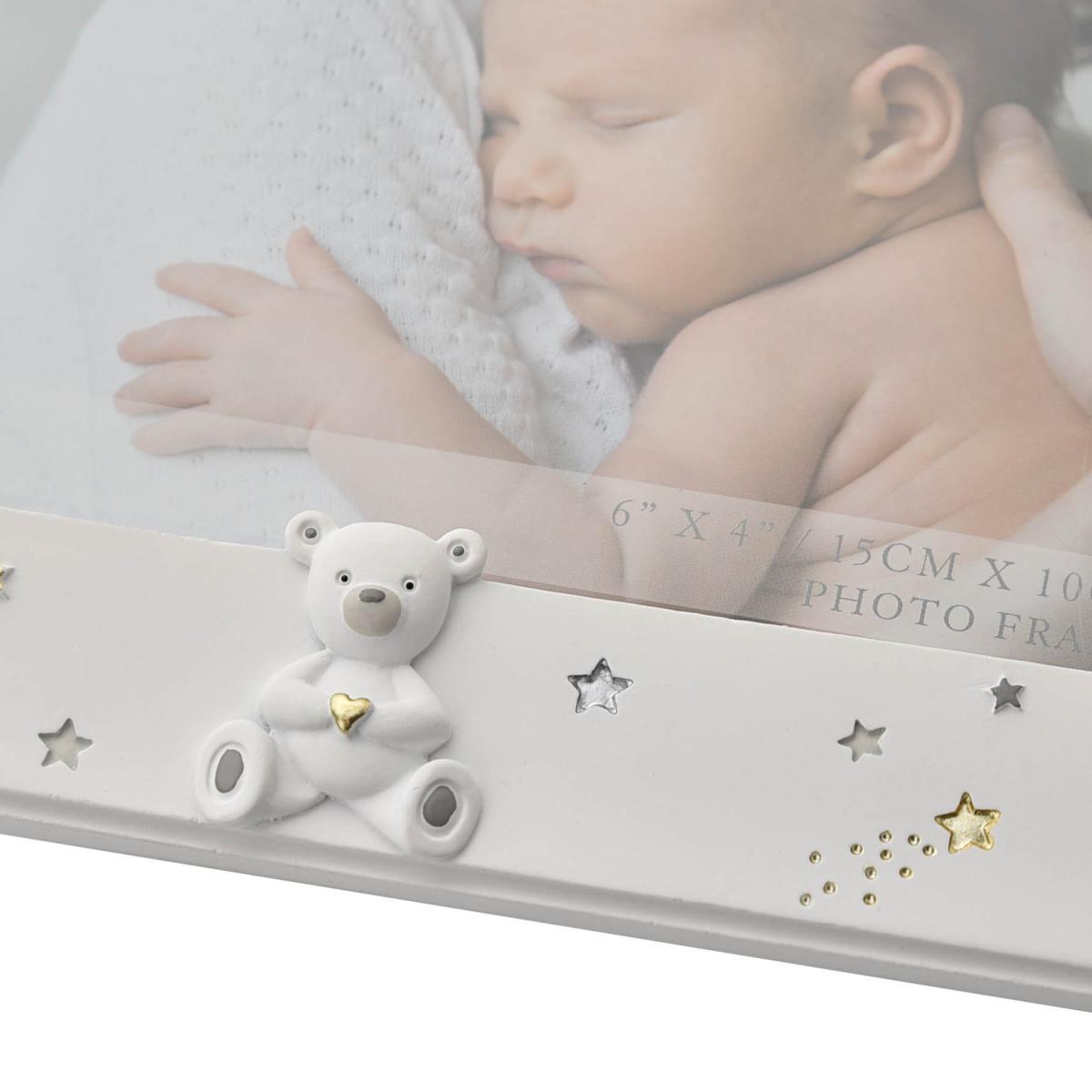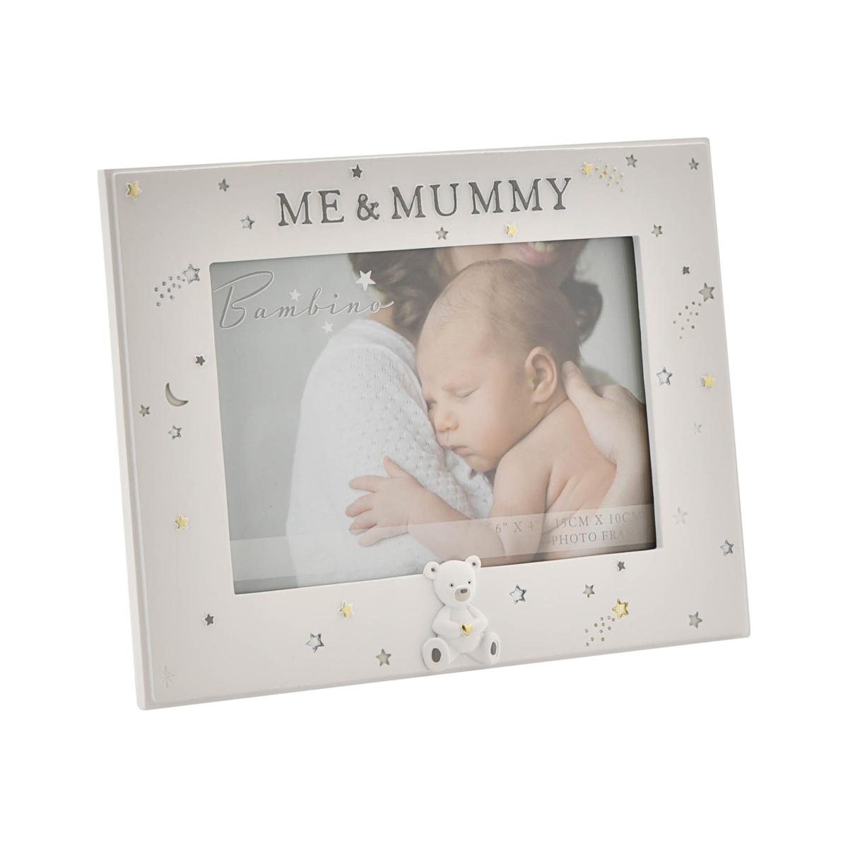 * Perfect as a gift for a loved one* Freestanding frame* Single photo frame A Me & Mummy photo frame from BAMBINO BY JULIANA. This affectionately personalised frame is a heart-warming gift for new mothers. The freestanding, white resin frame features a landscape aperture. It is finished with hand painted ‘starry night’ decoration, adorable white teddy bear icon and complementary ‘Me & Mummy’ decal. The frame is packaged in a branded closed box.