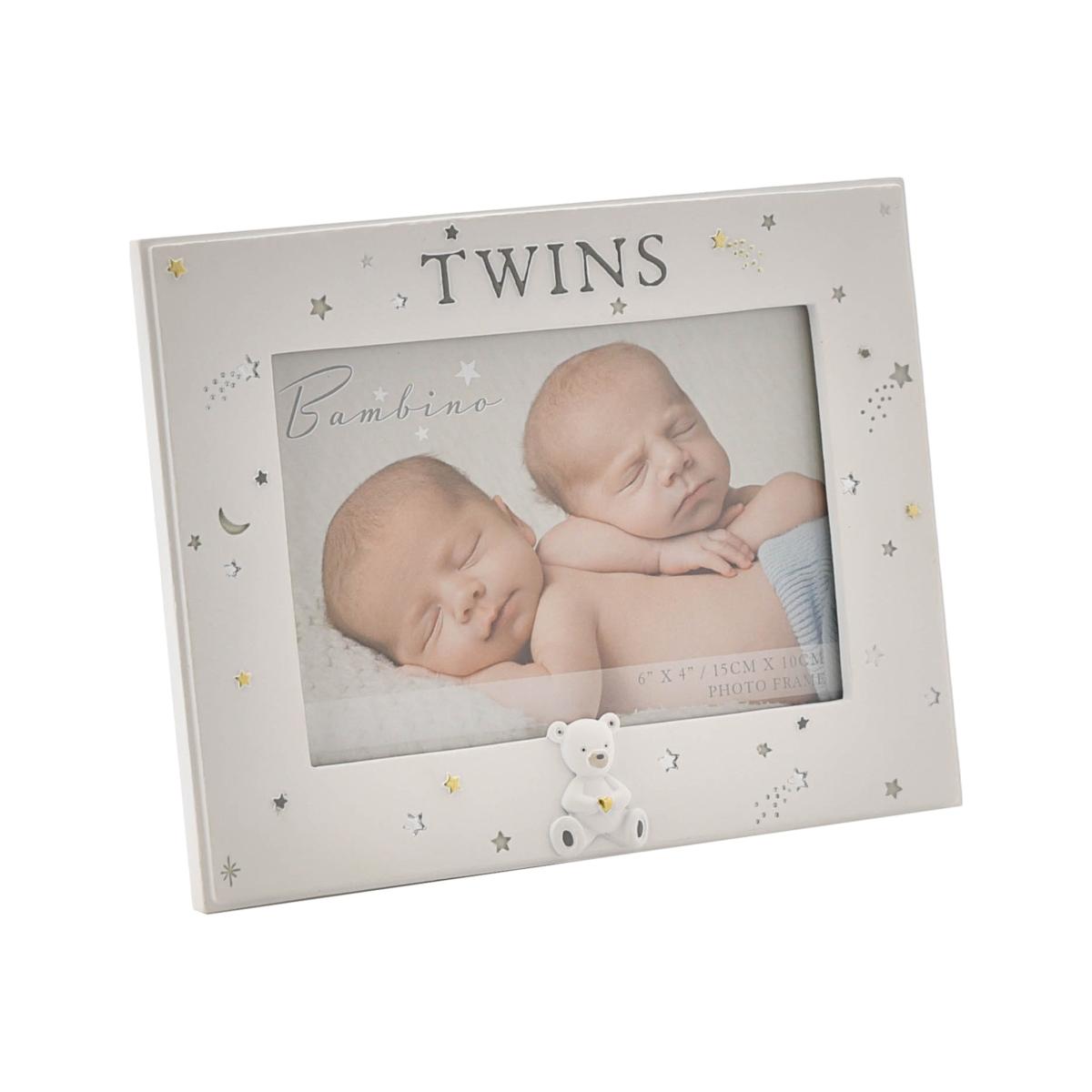 * Perfect as a gift for a loved one* Freestanding frame* Single photo frame A Twins photo frame from BAMBINO BY JULIANA. This affectionately personalised frame is a heart-warming gift for the parents of new born twins. The freestanding, white resin frame features a landscape aperture. It is finished with hand painted ‘starry night’ decoration, adorable white teddy bear icon and complementary ‘Twins’ decal. The frame is packaged in a branded closed box.