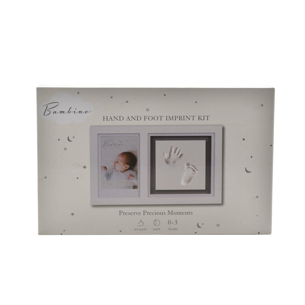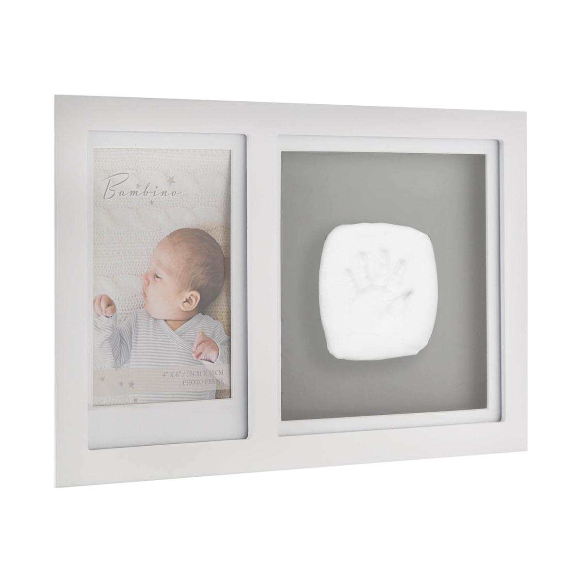 * Perfect as a gift for a loved one* Wall mounted frame* Single photo frame A white photo frame and clay print from BAMBINO BY JULIANA. This heart-warming frame captures the perfect cast of little hands or feet which will last forever. The wooden box frame has a matt white finish and is designed for wall hanging. It features two apertures: one portrait, for displaying a baby photo and one square, for presenting either a footprint or handprint using the kit provided. Full instructions on how to use included. The frame is packaged in a branded closed box.