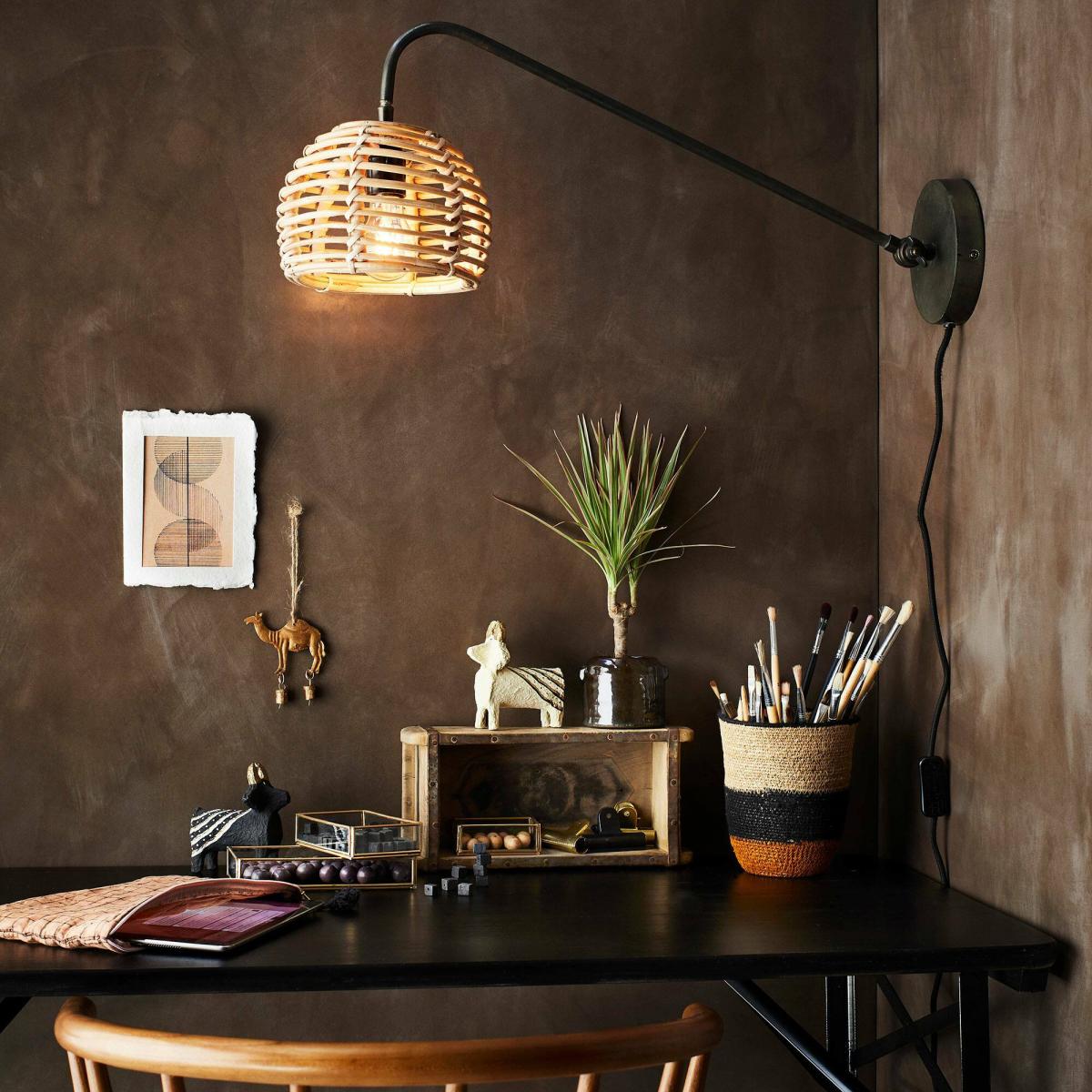 A Scandi-inspired wall light with an adjustable iron frame and contrasting shade made of natural, sustainable bamboo. Perfect for bedside or home office.