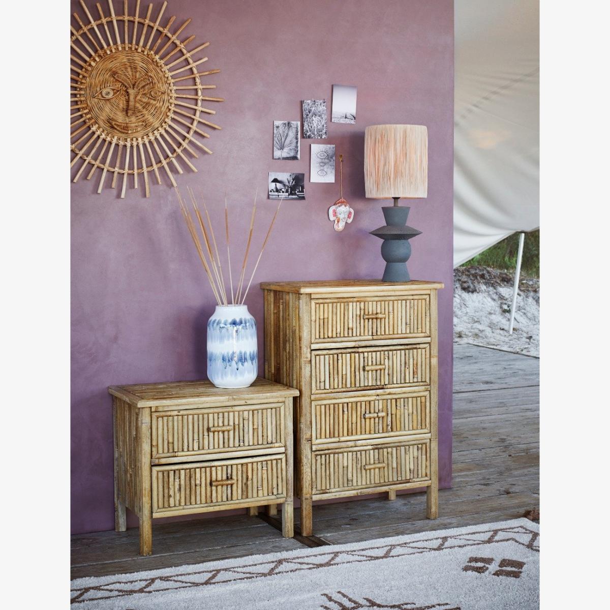 I love the bamboo chest of drawers for its natural texture and relaxed vibe, making it a versatile piece for both contemporary and boho interiors. It works well in bedrooms, living rooms, or even entryways, adding warmth and texture without feeling overpowering. When styling, consider pairing it with other rattan or wood accents for a cohesive look. Practical tips include keeping accessories minimal on top to highlight its natural grain, and using its varying sizes creatively-perhaps one as a bedside table and the other as additional storage-while balancing the look with soft textiles or greenery to soften the overall aesthetic.