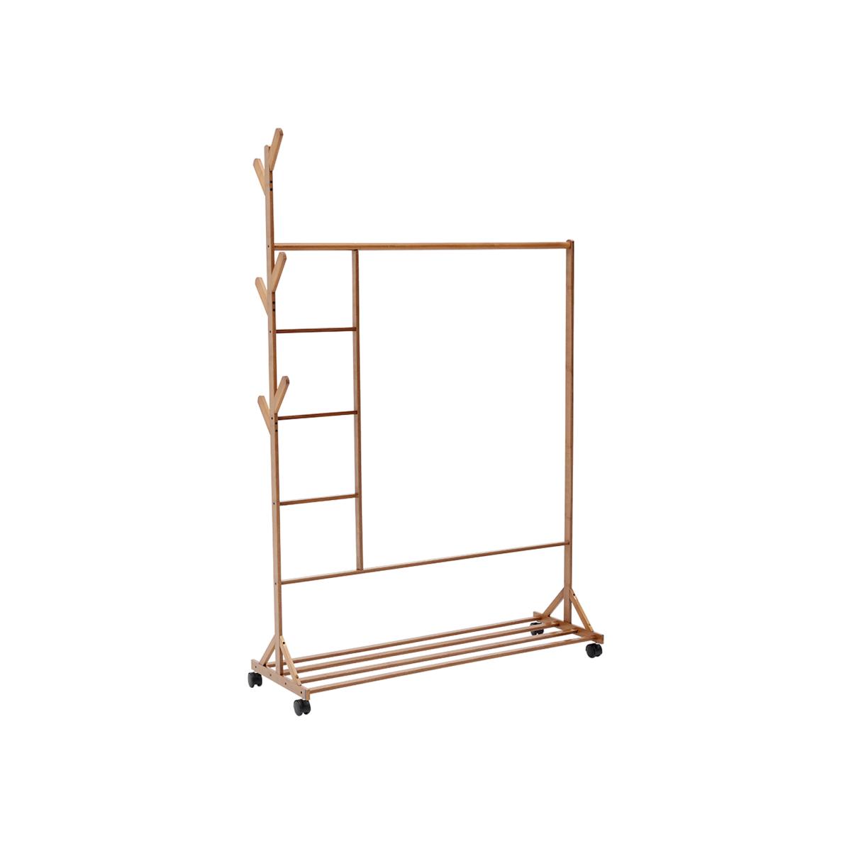 This versatile garment rack provides a simple mobile wardrobe, adding a rustic yet gentle charm to your space. Crafted from solid bamboo with a natural finish, it combines style with practicality. The rack is wide and tall enough to hold all types of clothing, from coats and shirts to trousers. Six side hooks offer extra space for bags, hats and scarves, while the bottom shelf keeps shoes and storage baskets neatly organised.