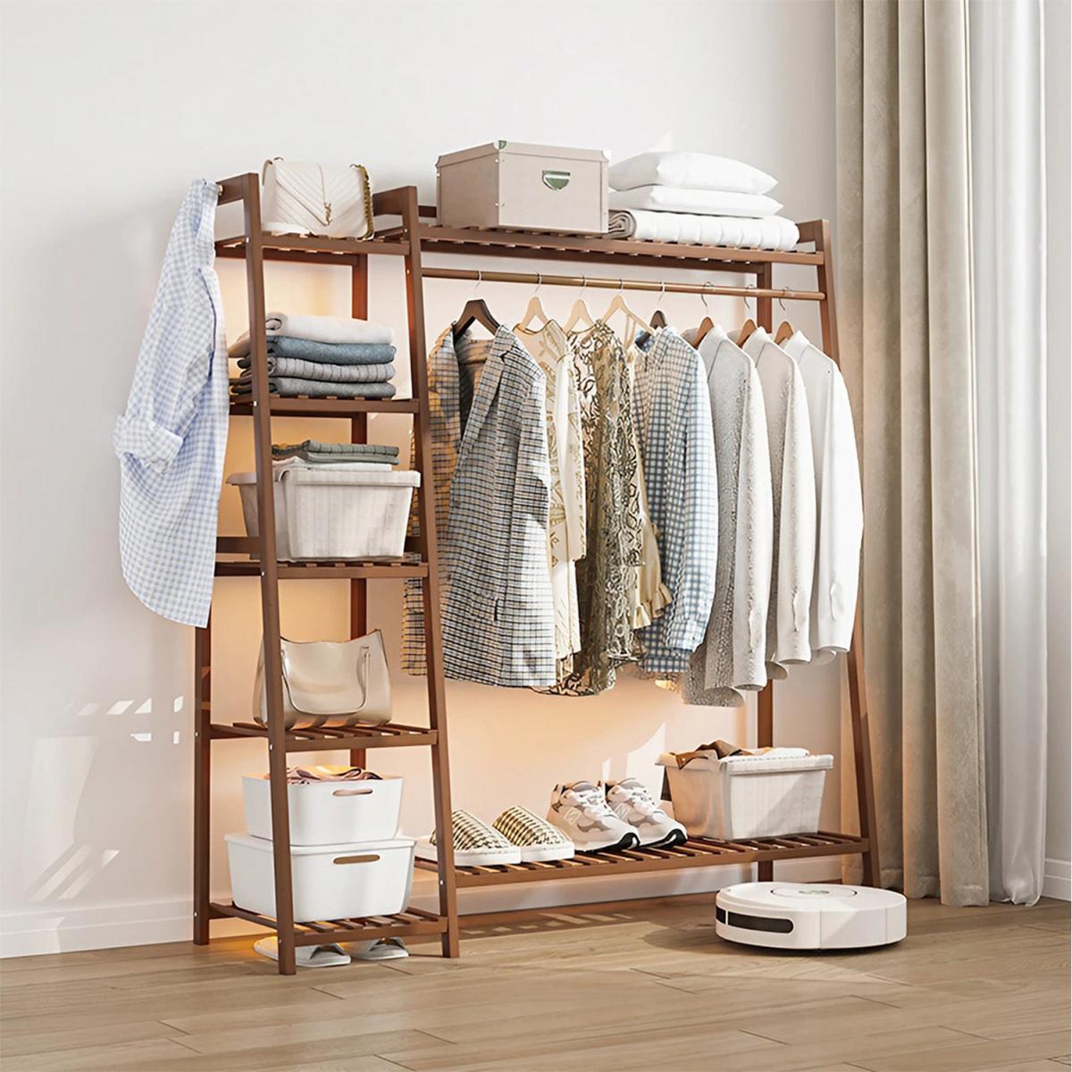 Need extra storage for your clothes? This bamboo clothes rail offers a 5-tier side shelf, hanging rod, side hooks, and top and bottom shelves for coats, shirts, shoes, and bags. Its trapezoidal design ensures stability, while the natural bamboo material adds durability. With its fresh and versatile look, this clothing rack complements any room decor effortlessly.
