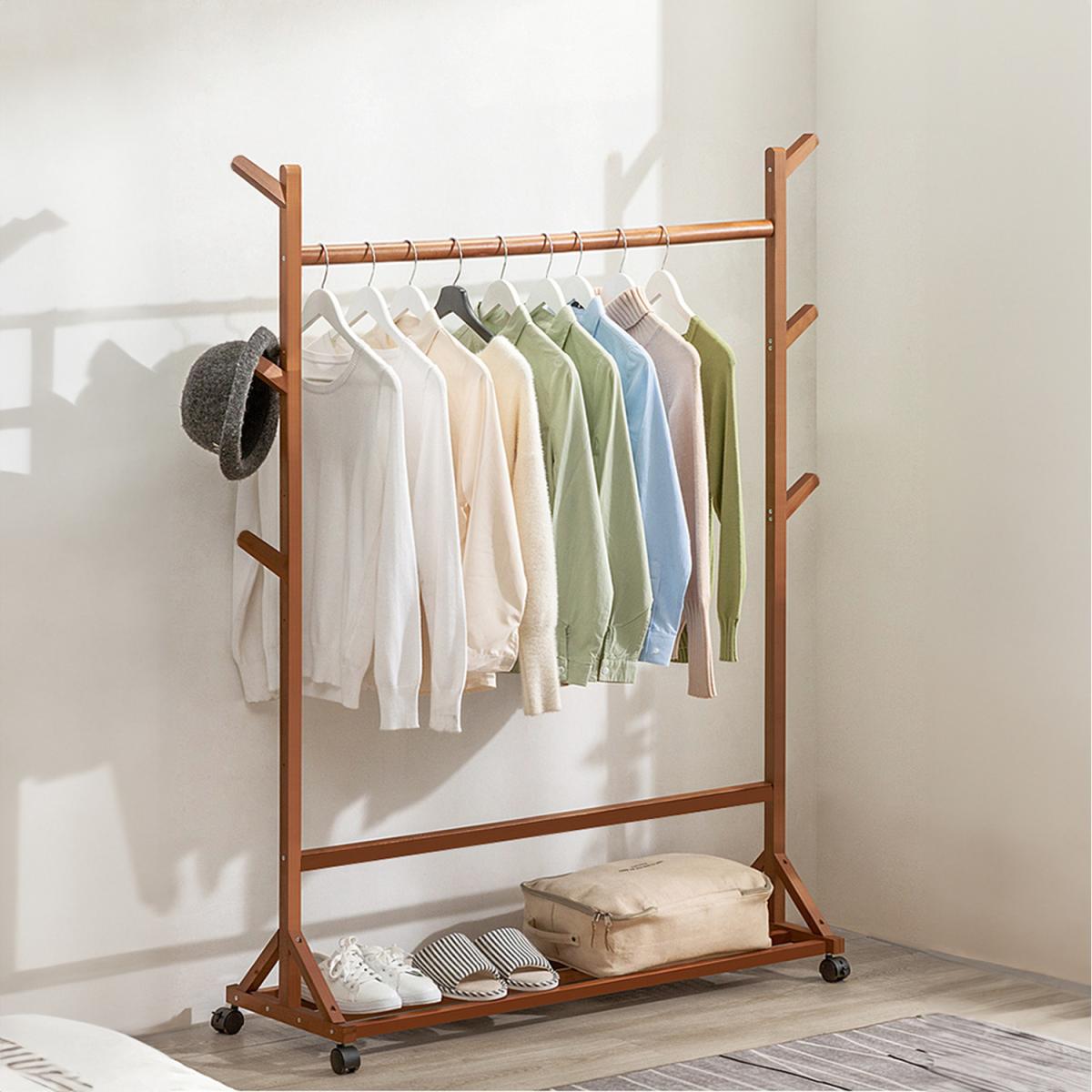 This bamboo coat rack brings a touch of nature charm to your home with its simple, natural design. Featuring three side racks on each side, it offers ample space to hang handbags, scarves, hats, and more. The tall structure accommodates clothes of varying lengths, while the bottom rack provides additional storage for shoes and other essentials. Equipped with wheels, this coat rack can be easily moved to any room as needed. The combination of side racks and a bottom shelf keeps items organized, making it a versatile addition that helps maintain a tidy, well-arranged space.