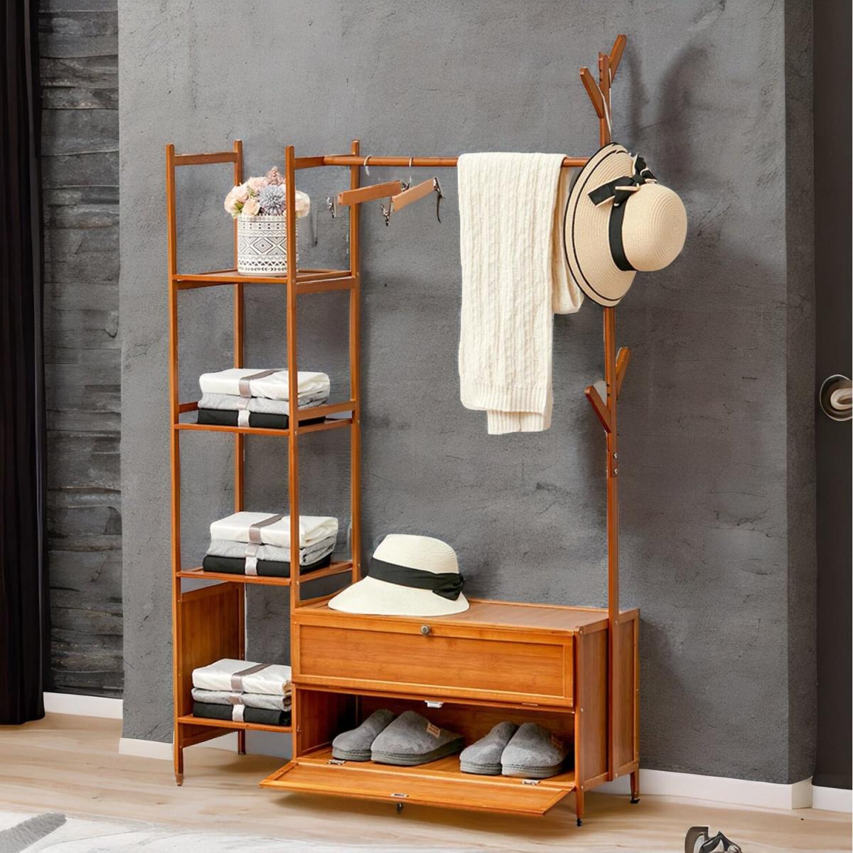This unit offers various compartments with 3 versatile sections, 6 handy hooks, 4 spacious shelves, and 2 convenient drawers for effective organization and storage of your items. Crafted from natural bamboo, this storage solution is not only durable but also stable, ensuring a long-lasting and reliable piece for your space. Ideal for storing folded, long, and short hanging garments, this versatile storage unit provides ample space to meet your storage needs. With a width of 100cm, depth of 30cm, and height of 162cm, these dimensions make it a perfect fit for various spaces, allowing you to optimize your storage capacity without sacrificing style. Simple Assembly Designed for ease, this storage unit is easy to assemble, providing a hassle-free setup process for your convenience.