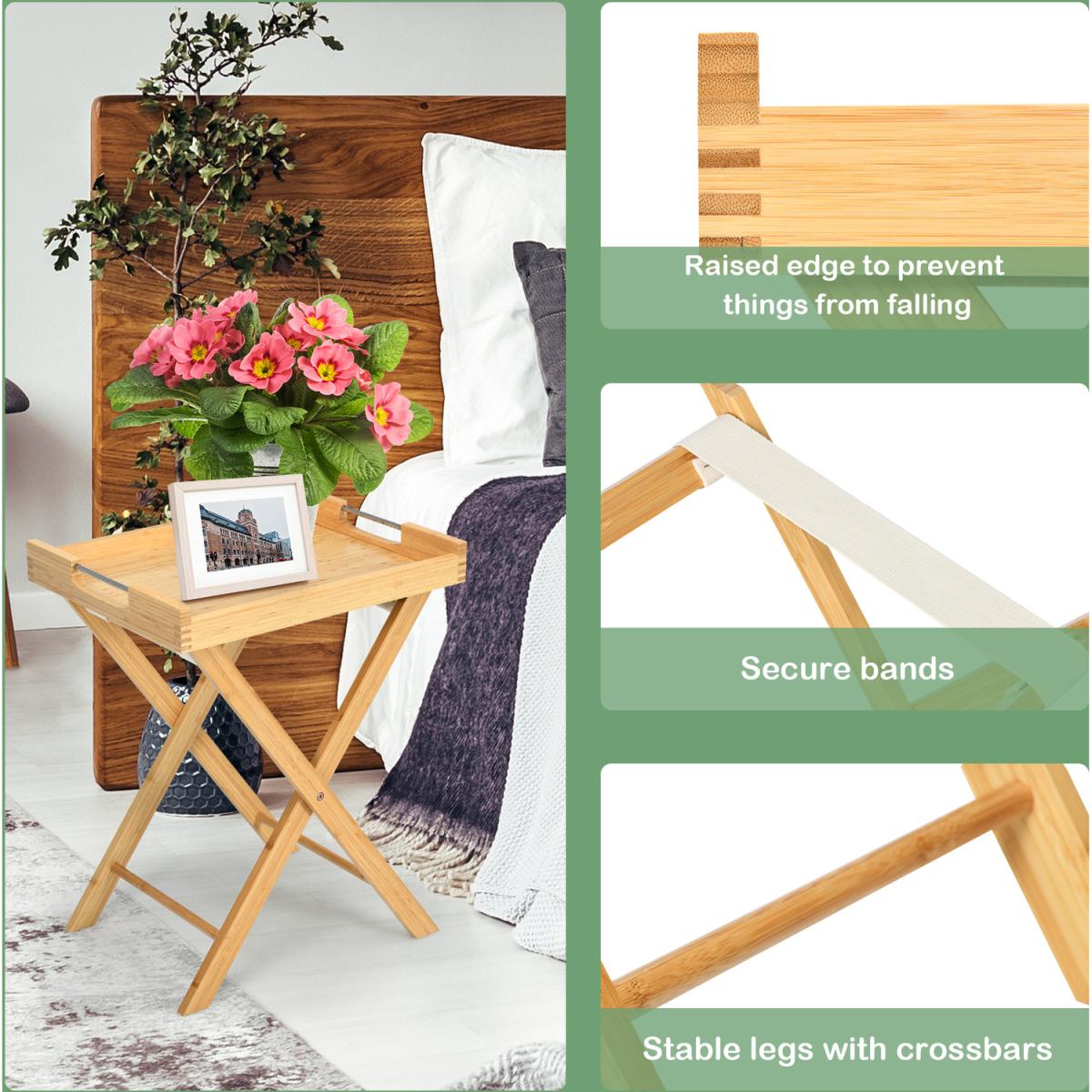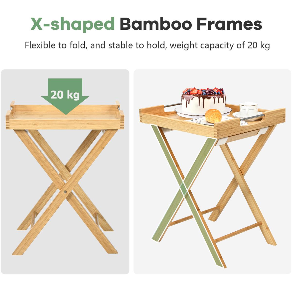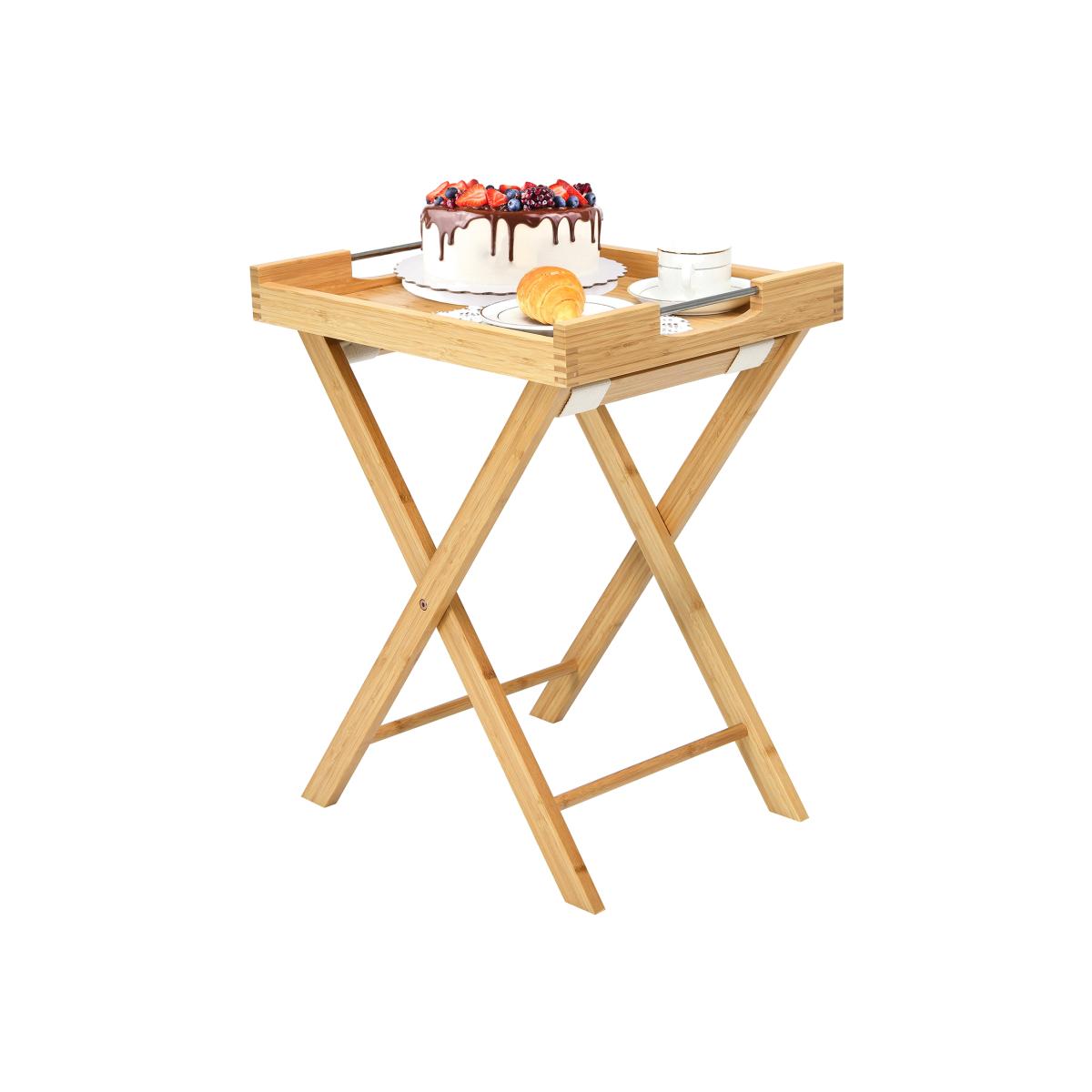 This multifunctional table is lightweight, sturdy and stylish, perfect for being used as a coffee table, an end table or a TV tray. Featuring a removable tray top, it allows extensive use. There are steel handles on both sides of the tray, so you can easily pick it up from the base, serving food from the kitchen to anywhere as required. What's more, the folding base is designed for convenient storage and transport, making the unit an ideal snack holder for picnics, outdoor dining and more. In addition, the tray is made of natural bamboo, which not only provides natural and simple charm for interior decoration, but also ensures a long service life. The surface has been smoothly polished, so that you can easily wipe off stains or spills.