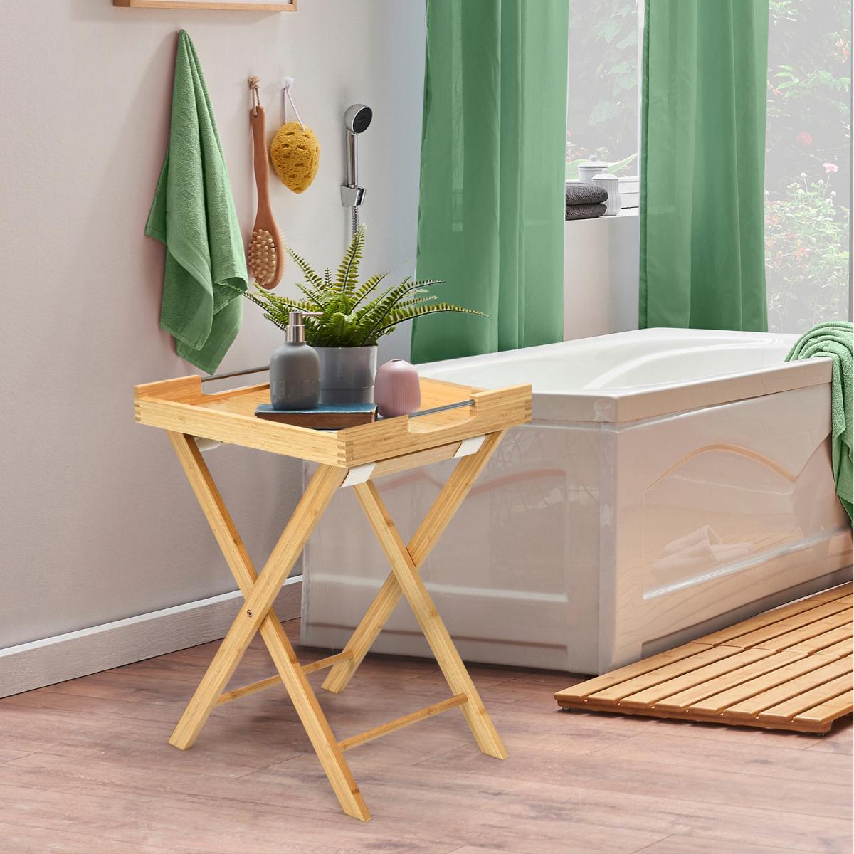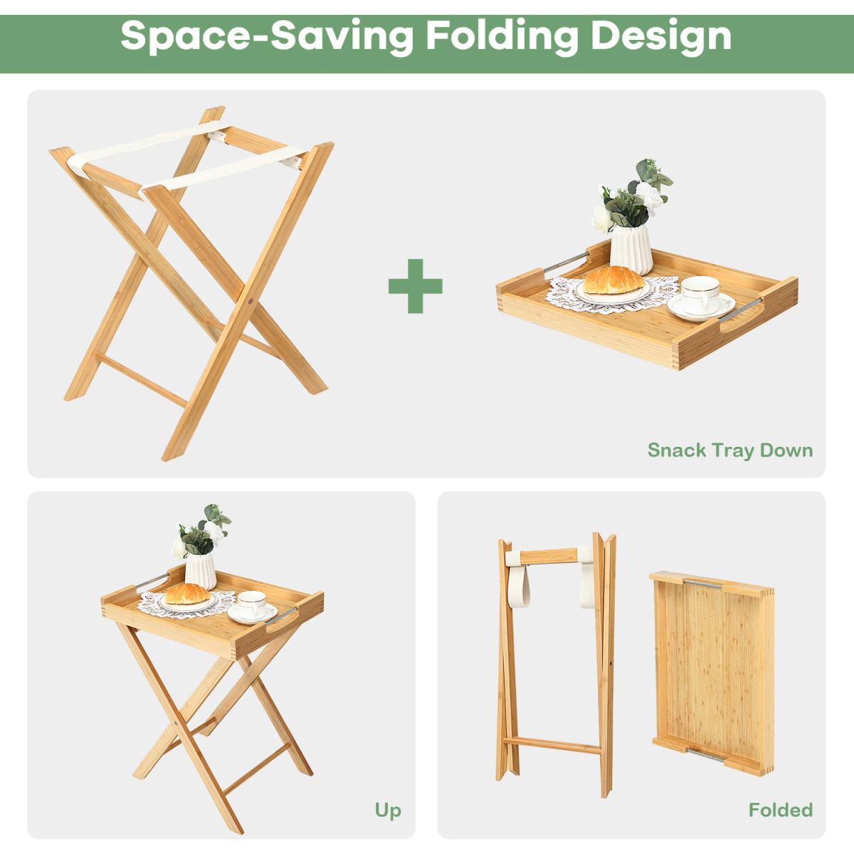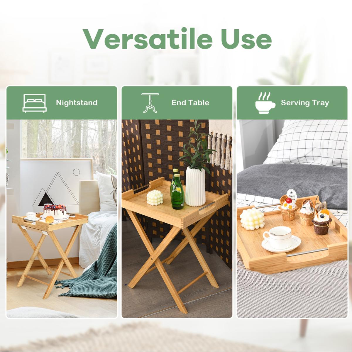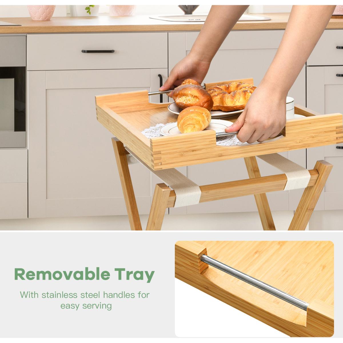 This multifunctional table is lightweight, sturdy and stylish, perfect for being used as a coffee table, an end table or a TV tray. Featuring a removable tray top, it allows extensive use. There are steel handles on both sides of the tray, so you can easily pick it up from the base, serving food from the kitchen to anywhere as required. What's more, the folding base is designed for convenient storage and transport, making the unit an ideal snack holder for picnics, outdoor dining and more. In addition, the tray is made of natural bamboo, which not only provides natural and simple charm for interior decoration, but also ensures a long service life. The surface has been smoothly polished, so that you can easily wipe off stains or spills.
