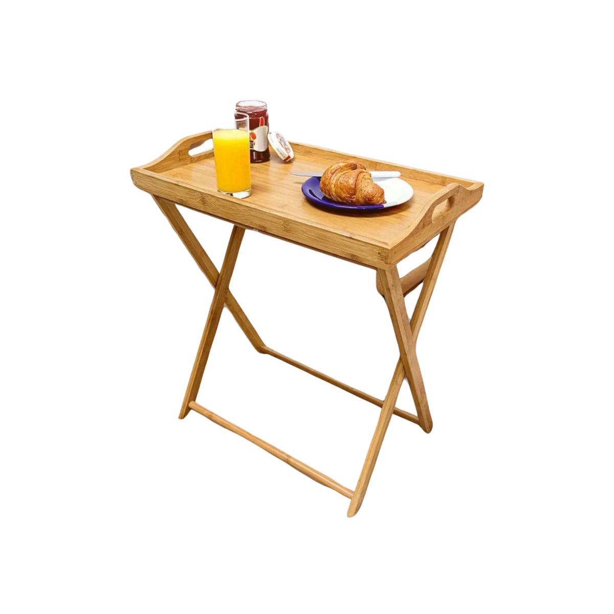 Crafted from natural bamboo, this side table boasts stability, eco-friendliness, and durability. Its smooth finish ensures easy cleaning with just a damp cloth. This space-saving table with a tray can serve as a side table, coffee table, tea table, couch table, or reading table, making it suitable for various settings in both home and office environments. The natural color and chic design of this table complement any room decor effortlessly. Its foldable feature adds to its convenience and practicality. When unfolded, the table measures 55 x 35 x 63.5 cm (L x W x H), while the folded size is 67 cm H x 52 cm L x 6 cm W. The tray dimensions are 7 cm H x 55 cm W x 35 cm D. Equipped with side handles for easy carrying, this tray table is perfect for welcoming guests in the kitchen, living room, or bedroom.
