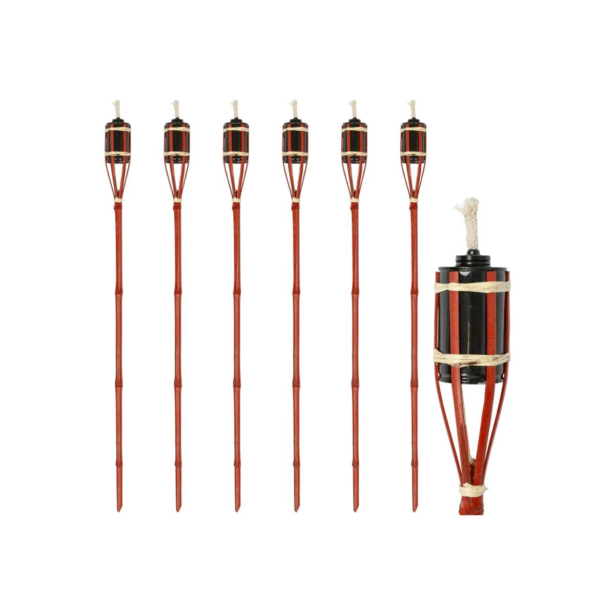 This set of 6 Bamboo Garden Torches lets you transform your garden, courtyard, patio or terrace into your very own tropical island paradise. Originating in the cultures of the Hawaiian and Polynesian island, the so-called 'Tiki Torch' gained widespread popularity in the United States during the 1930s. That popularity persists to the present day, with contemporary equivalents of all shapes, sizes and materials now found within homes, gardens, bars and restaurants around the world. Our own Tiki Torches seek to bring both tradition and modernity together, combining the classic natural bamboo structure with a sleek metal fuel chamber to create a result that works every bit as well as it looks. The angled tip of the pole lets you easily stake it into the ground - perfect for lining garden pathways or perimeters - while the removable screw top makes filling with your fuel of choice a piece of Polynesian cake!