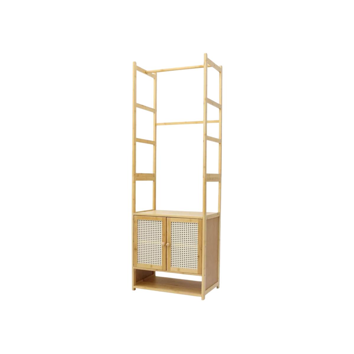 This clothes rack offers multiple storage solutions, effectively organizing your wardrobe space and eliminating the clutter in your closet. It ensures your wardrobe is neat, orderly, and easily accessible. Featuring a top rod, side rods, cabinet, and shoe rack, this multifunctional clothes rack provides ample space for clothes, bags, shoes, and more. It integrates hanging, storage, and stacking functionalities, eliminating the need for additional storage boxes. Crafted from Nan bamboo, known for its durability and smooth texture, this rack is tougher than traditional wood.