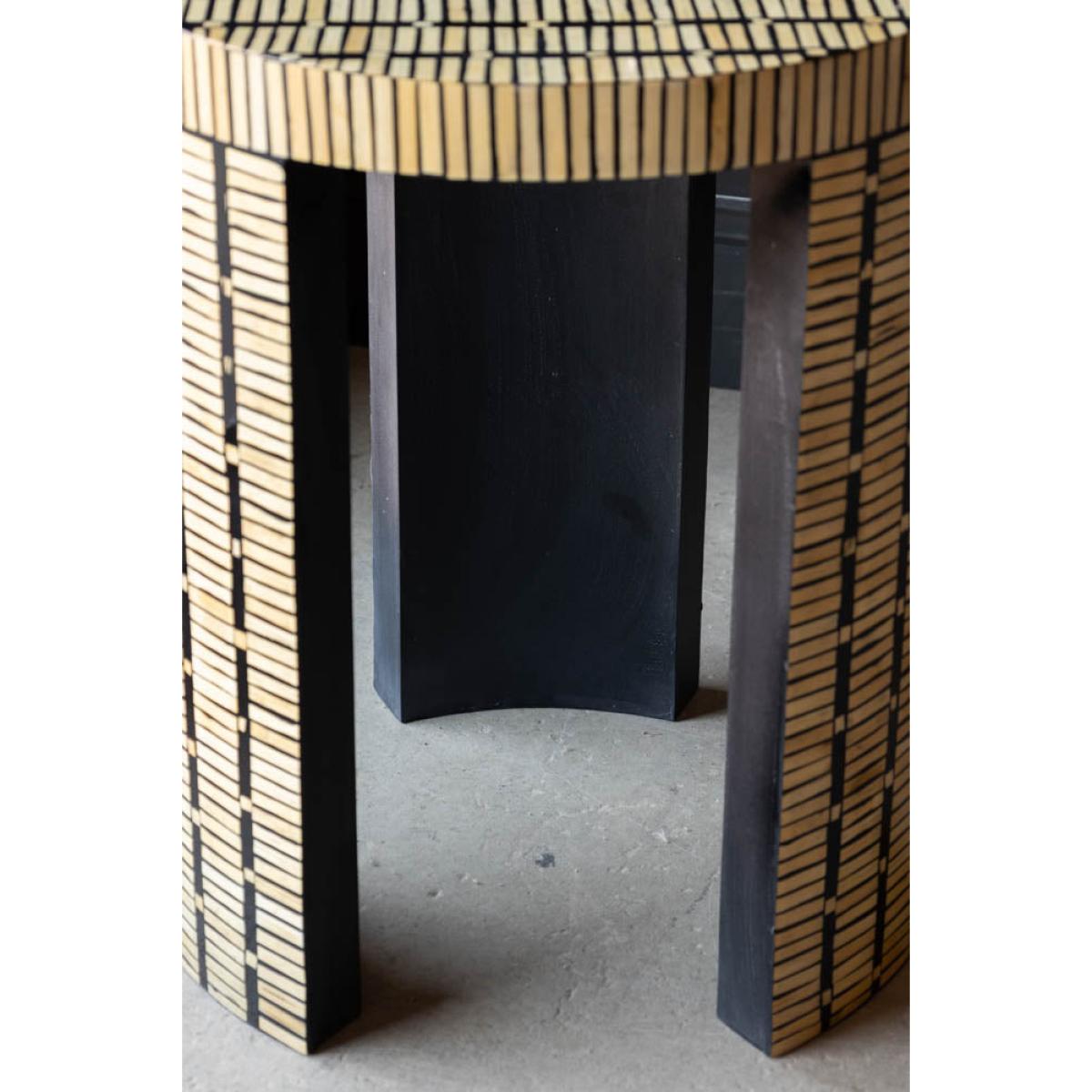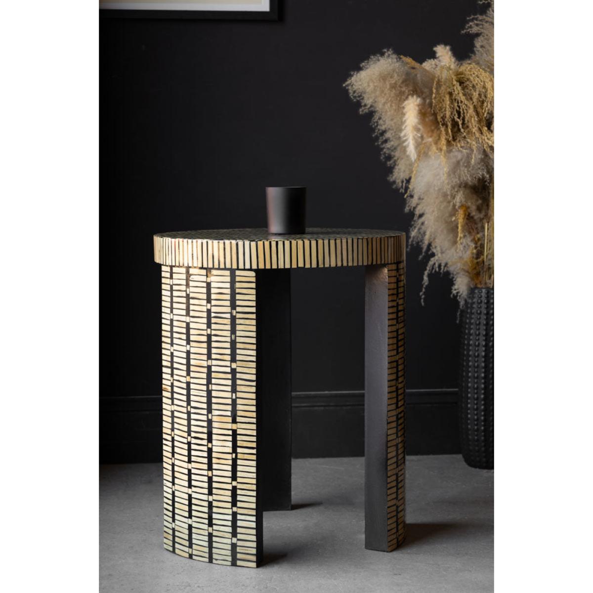 This round side table is all clean lines, rich textures and smart, sophisticated vibes. With its chic bamboo inlay effect pattern wrapping around those sleek three legs and across the tabletop, it’s the kind of modern coffee table that quietly shows off without even trying. It feels fresh, organic and just a little bit fancy. Perfect as a side table for the living room, or as a stylish bedside sidekick. It’s got that earthy, modern thing going on while still being glam enough to catch the eye.                                                                                               - Bamboo Inlay Effect Side Table- Measures:H61cm x D50cm- Materials: Bamboo & Fibreboard