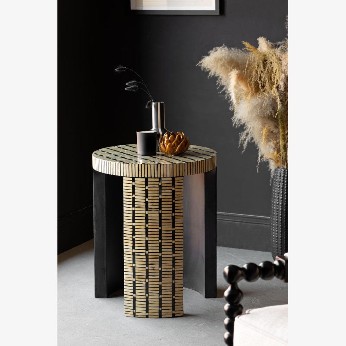 I love this little table for its versatile and contemporary appeal. The bamboo inlay effect adds warmth and texture, making it a great statement piece in both modern and eclectic interiors. It works particularly well in spaces with natural or earthy tones, and can be styled alongside neutral upholstery or lush greenery to create a calming, inviting vibe. For practical styling, consider using it to hold a small lamp, a book, or decorative objects like vases or candles - it’s a handy yet stylish addition next to a sofa, armchair, or bed. Its size and visual interest also make it perfect for adding a touch of personality without overwhelming the space.