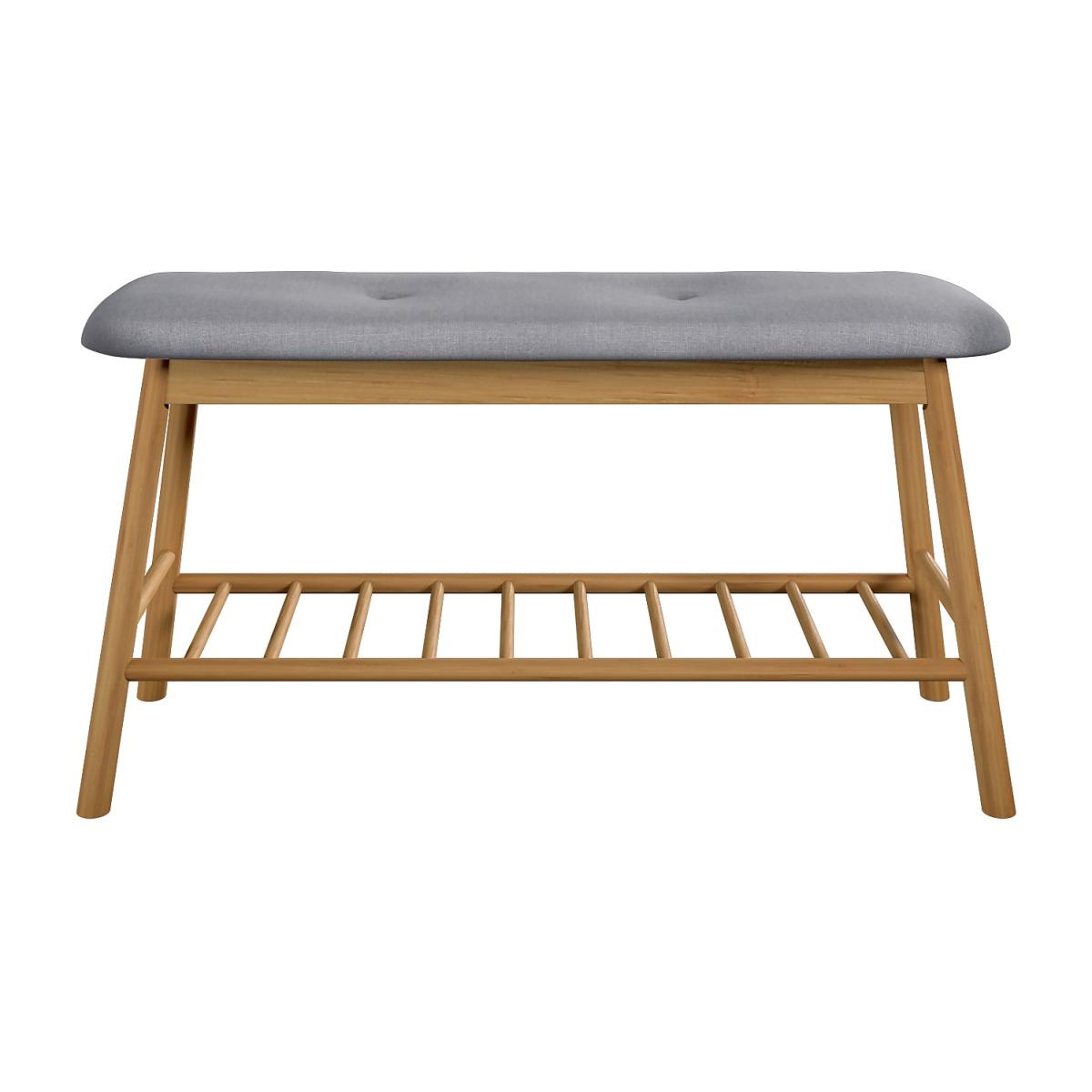 Whether you’re coming in or going out the Living Elements Furniture Bamboo Shoe Bench with grey Cushion Seat is the perfect entryway storage solution for footwear in your home. Featuring a sturdy bamboo frame and topped with a stylish grey cushion for comfort, this can also be neatly stored at the end of the bed to assist getting ready for a day at work or a night out. The generous bottom shelf can store shoes, spare cushions, blankets and bags. Please note this Bench is not suitable for outdoor use.