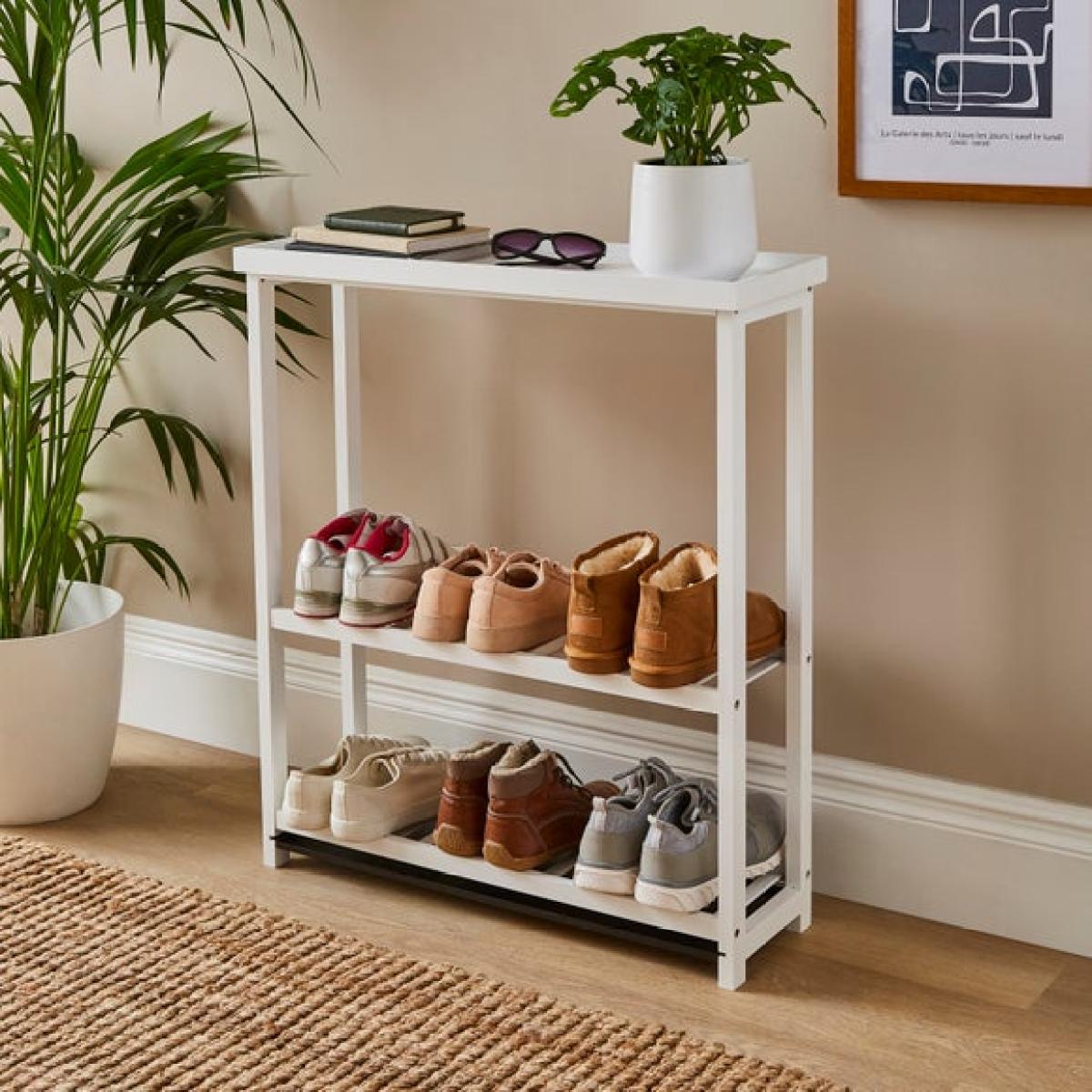 I love this shoe rack with table for its practicality and clean, minimal design. It works well in contemporary or Scandinavian-inspired interiors where simplicity and functionality are key. The addition of a table surface makes it perfect for keeping small accessories or a decorative item on top, adding versatility. For styling, consider arranging footwear by colour or style for a tidy look, and add a small tray or bowl on the top for keys or sunglasses. Its neutral white finish allows it to integrate seamlessly into most colour schemes, and placing it in a hallway or porch keeps shoes organised and the entryway welcoming.