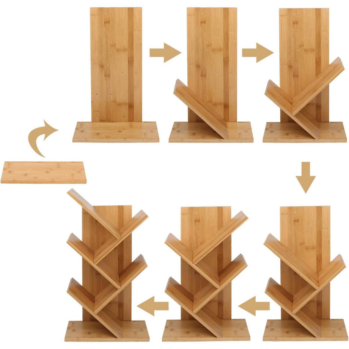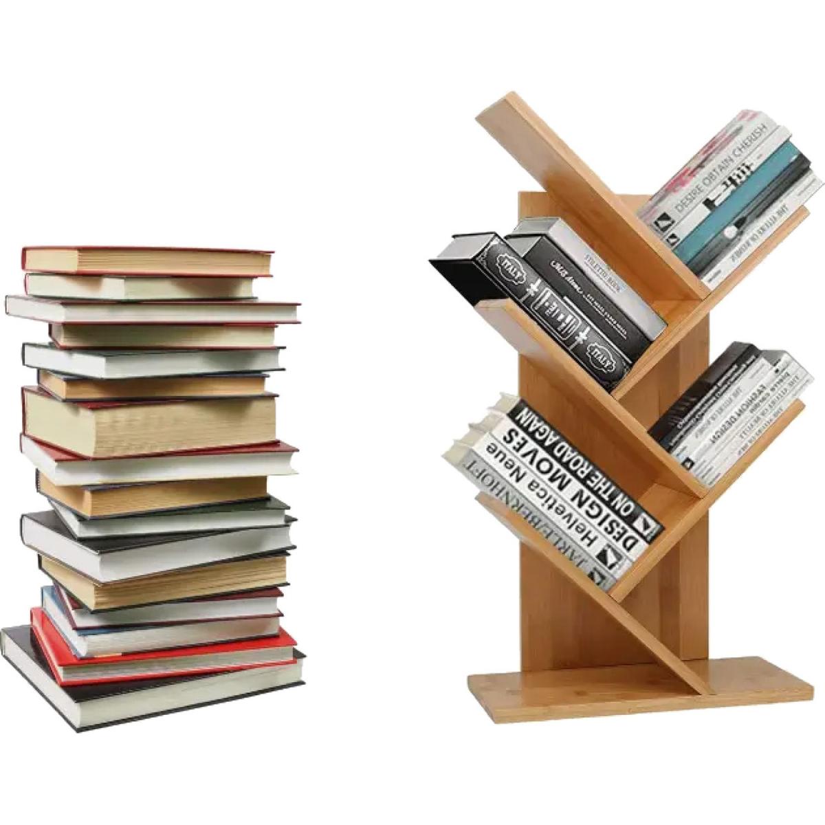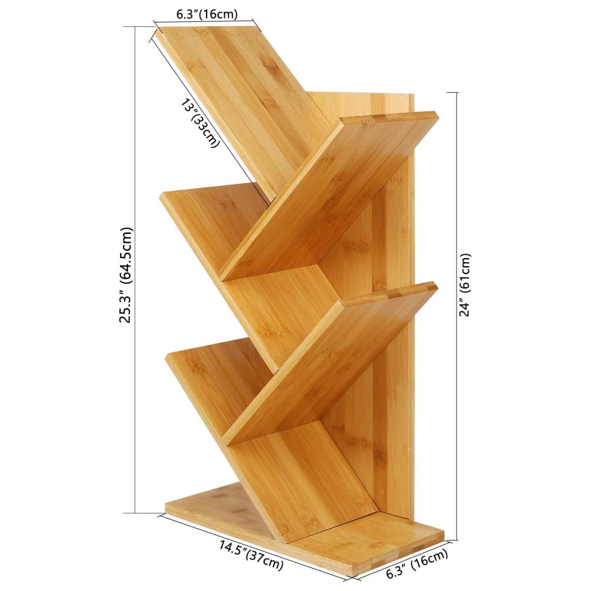With a modern styled independent open-air design, this tabletop display rack looks great whilst being functional with an easy reach that makes it the perfect display for books, CDs, magazines and more! The tree-like design allows it to occupy little space yet store many items, resulting in a wonderful addition to your bedside or desk. Multi-Functional: This artistic tree book-shelf is great for tight spaces with a creative way to store books. Perfect when working in offices to store books, with file folders and other decorative stuff, or in kids' rooms to organize photo albums and books. With simplistic elegance comes function perfect to decorate your home.100% Solid Bamboo: Made from 100% Solid Bamboo, the material proves to be more environmentally friendly and renewable than regular wood due to the speed at which it can be grown, in addition to being more load-bearing and durable than equivalent wood types at the price such as Beech or Maple Wood. The robustness of the bamboo construction ensures excellent build quality that's proven to last!Measurements: (W)37cm x (H)65cm x (D)18cm