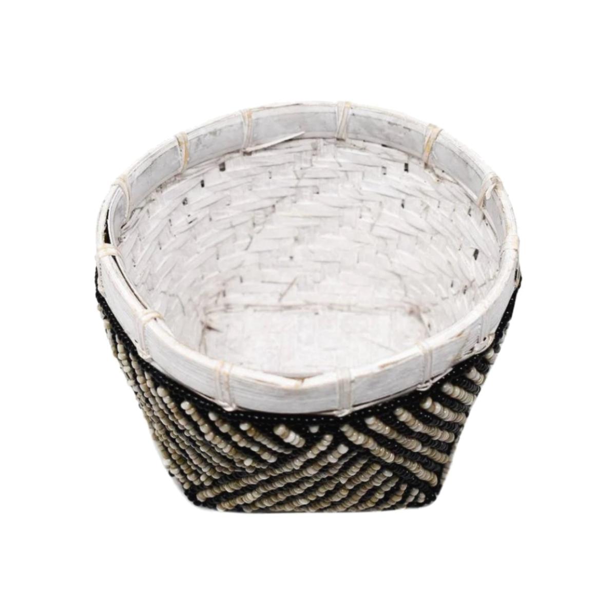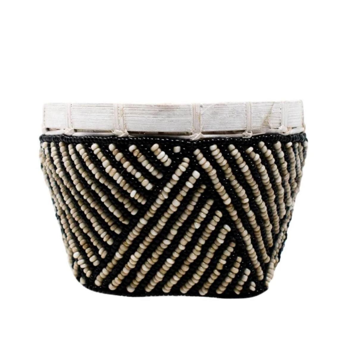* A beautiful hand-beaded small bowl perfect for storing jewelry, keys, change, bathroom objects such as cotton balls, or simply adding a touch of texture to a counter top in your home. * Structure of the Trinket Basket Made from Handwoven Balinese Bamboo * 100% Handwoven and Hand-beaded * Handmade by talented women artisans in Bali, and sustainably sourced with care. * All POPPY + SAGE Trinket Baskets come with our signature linen dust bag, a premium added touch to protect your basket.