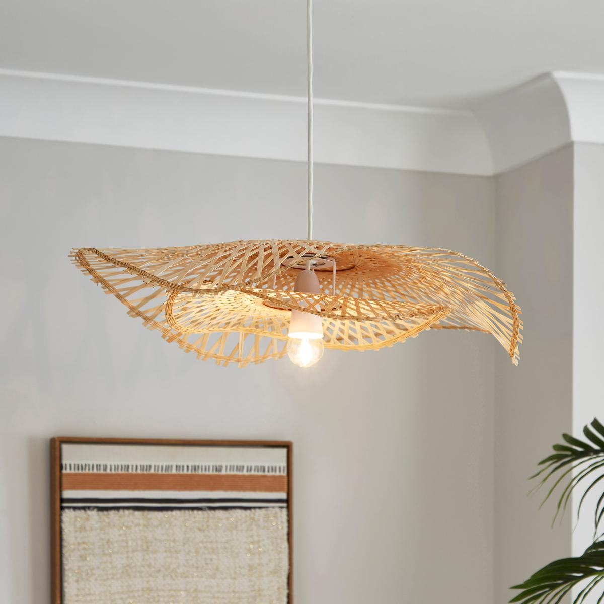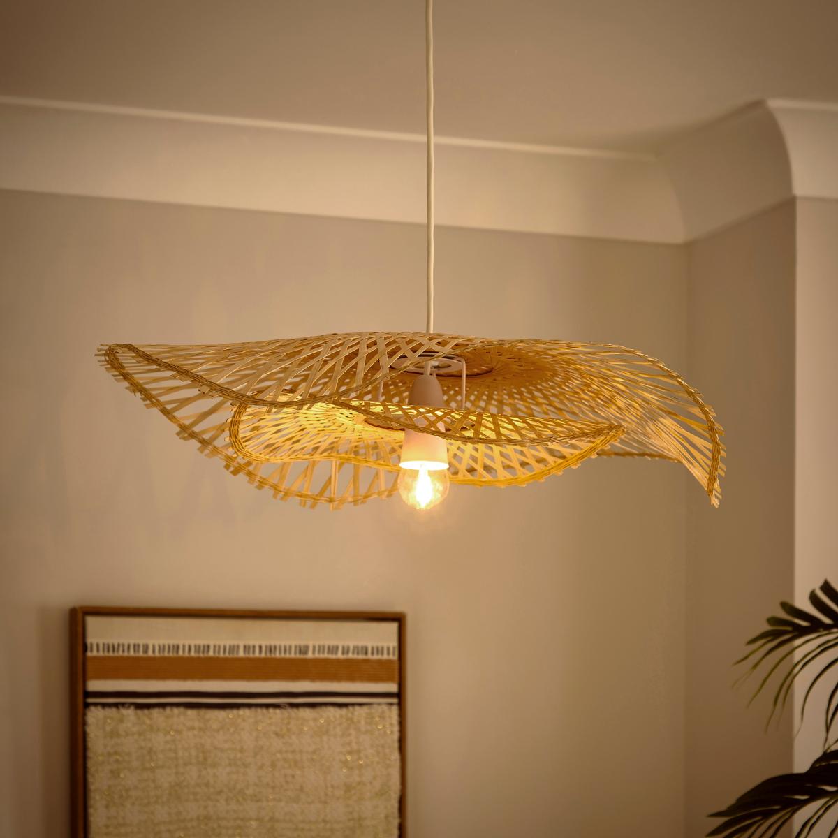 I love this shade because it combines natural material with a modern shape, making it a versatile choice for many interiors. It works particularly well in bohemian, coastal, or Scandinavian schemes where organic textures and relaxed aesthetics are key. The bamboo wave design adds visual interest without overwhelming the space, and its easy fit feature makes installation straightforward. For styling tips, consider pairing it with light, neutral colour palettes to highlight the natural wood or adding other woven accessories for a cohesive look. It’s especially effective over a dining table or in a breakfast nook, providing warm, diffuse lighting that enhances the space’s natural charm.