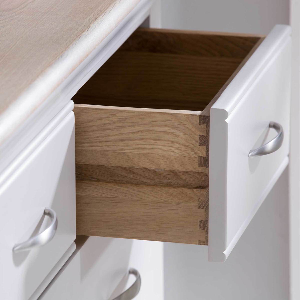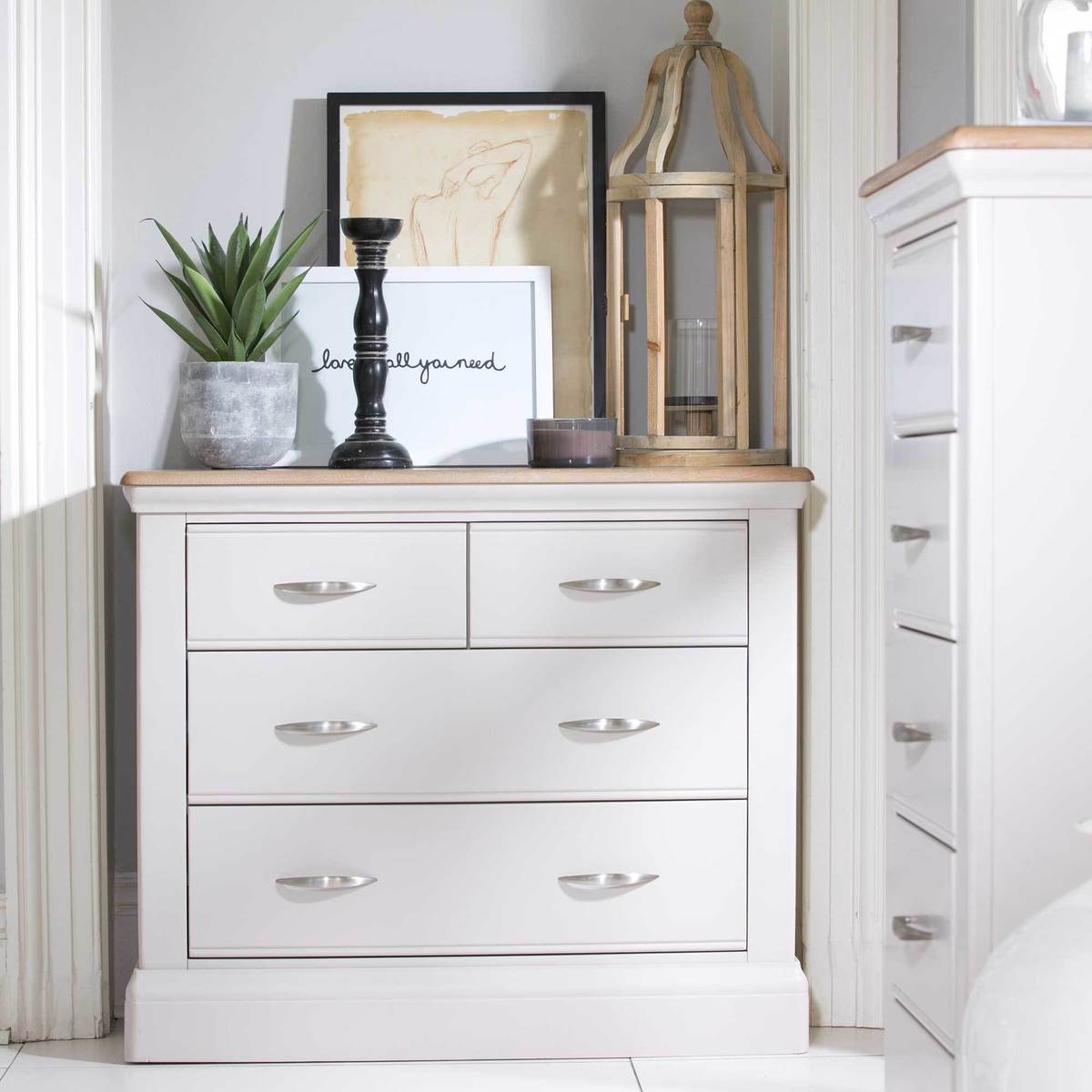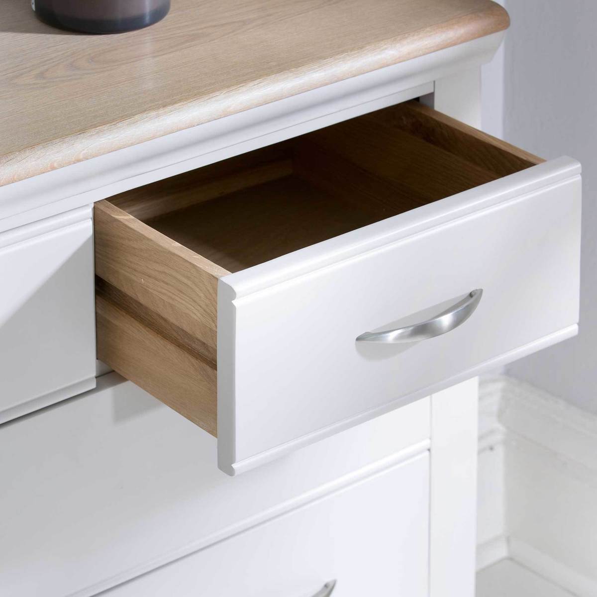 With a contemporary yet country cottage appeal, this charming chest of drawers from the Bambury range offers plenty of storage space with spacious drawers perfect for storing accessories, clothing and textiles. A collection based on simplistic design with lovely traditional features, its straight lines and corniced edges offer a timeless nature while its exposed wooden top provides an ideal spot to create a wonderful display full of your favourite accessory pieces.