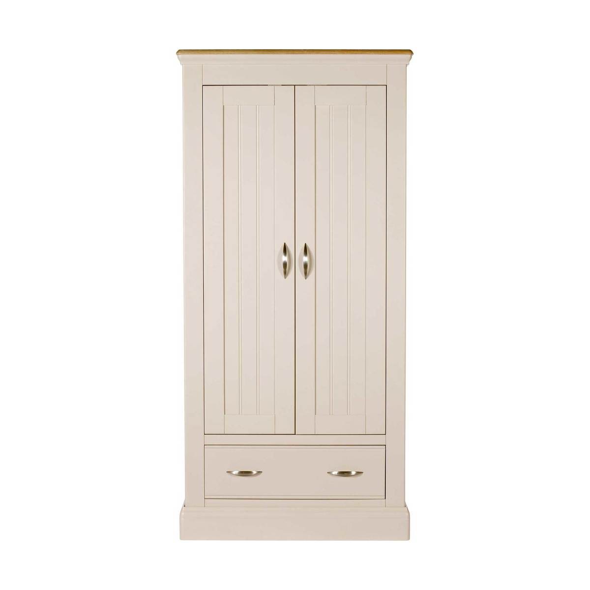 Beautifully crafted this practical and stylish wardrobe features a single fixed rail, large bottom drawer and two smaller drawers inside creating plenty of storage for all your clothing, accessories, shoes and even linens. Its corniced exposed oak top provides a beautiful finish with a warming appeal, contrasting beautifully against the neutral pallet of its stone painted finish. This wardrobe holds a versatile design with country appeal lending itself to both contemporary and traditional homes