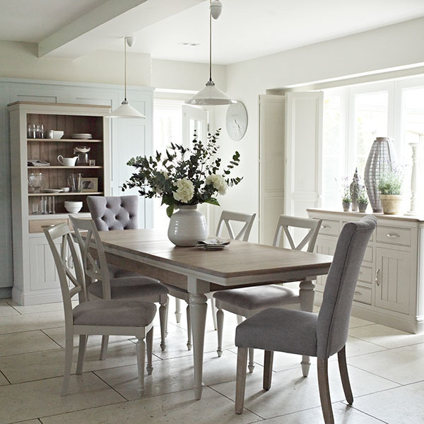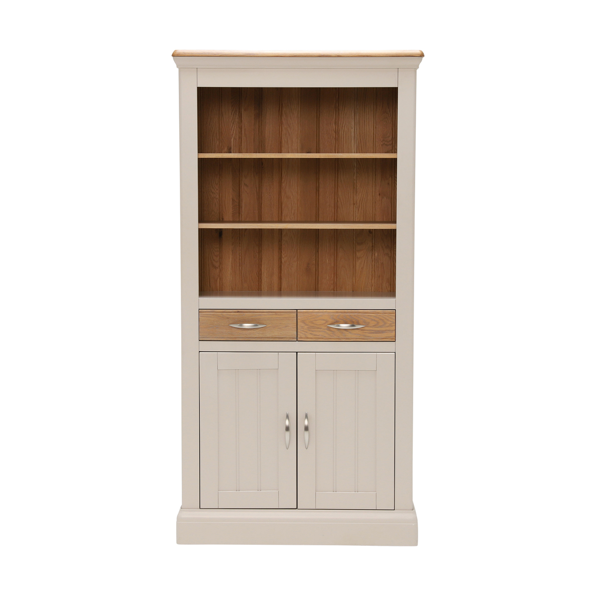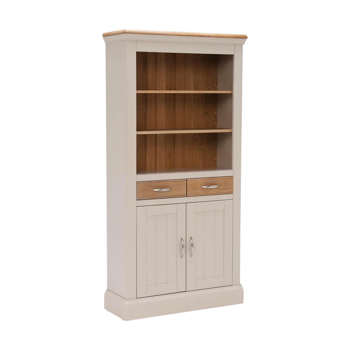 Add an elegant country appeal to your dining room with the Bambury Large Bookcase. The classic design is finished in a soft stone colour with washed oak detail and curved silver metal handles. Featuring a two-door cupboard, two drawers and three shelves, it makes a practical and stylish addition to your home, with space to store books or dinnerware.