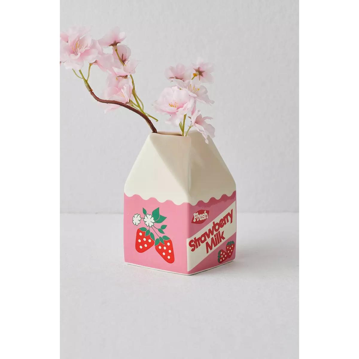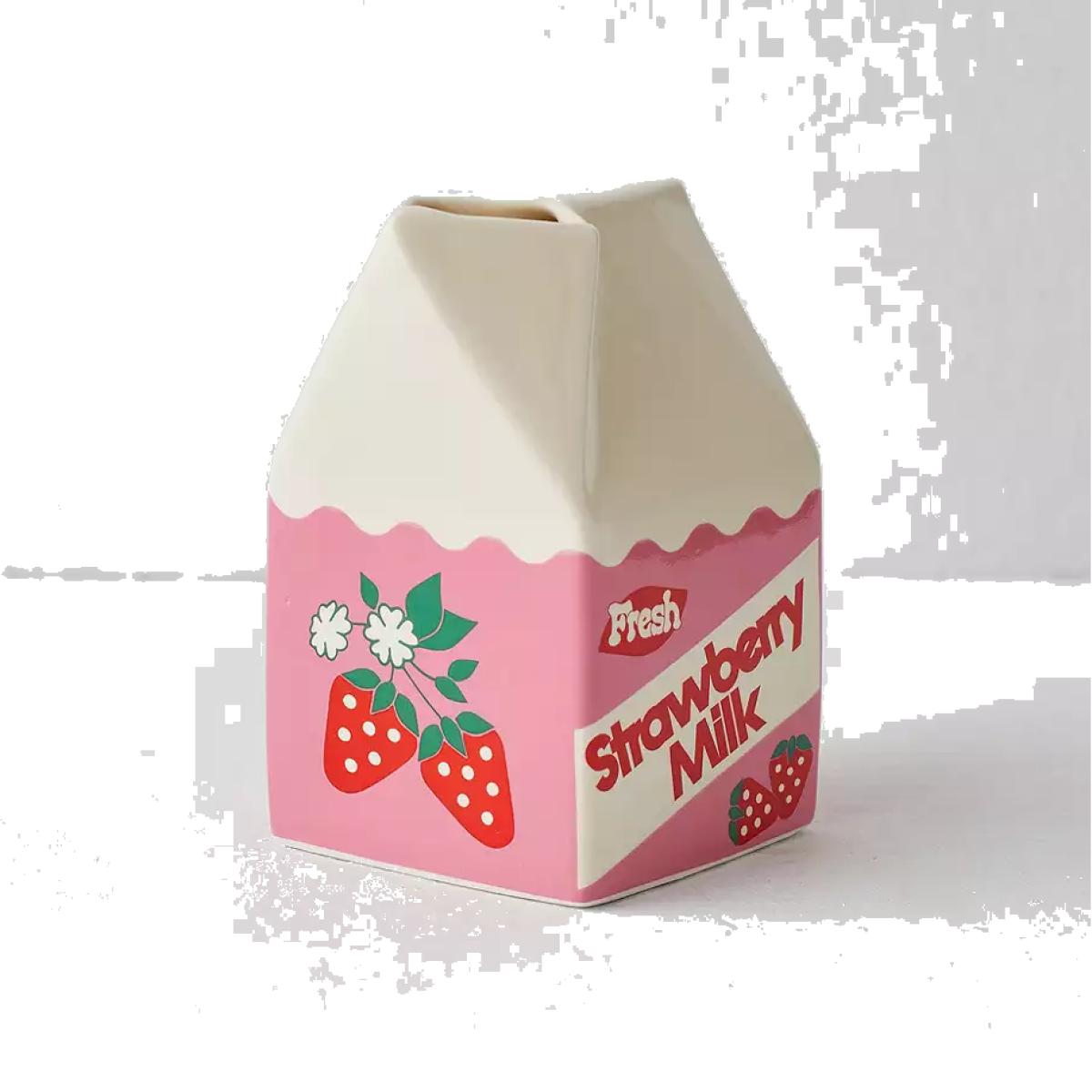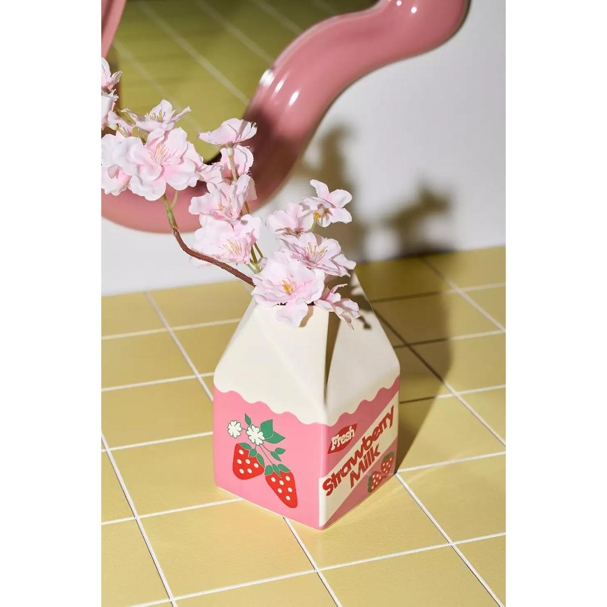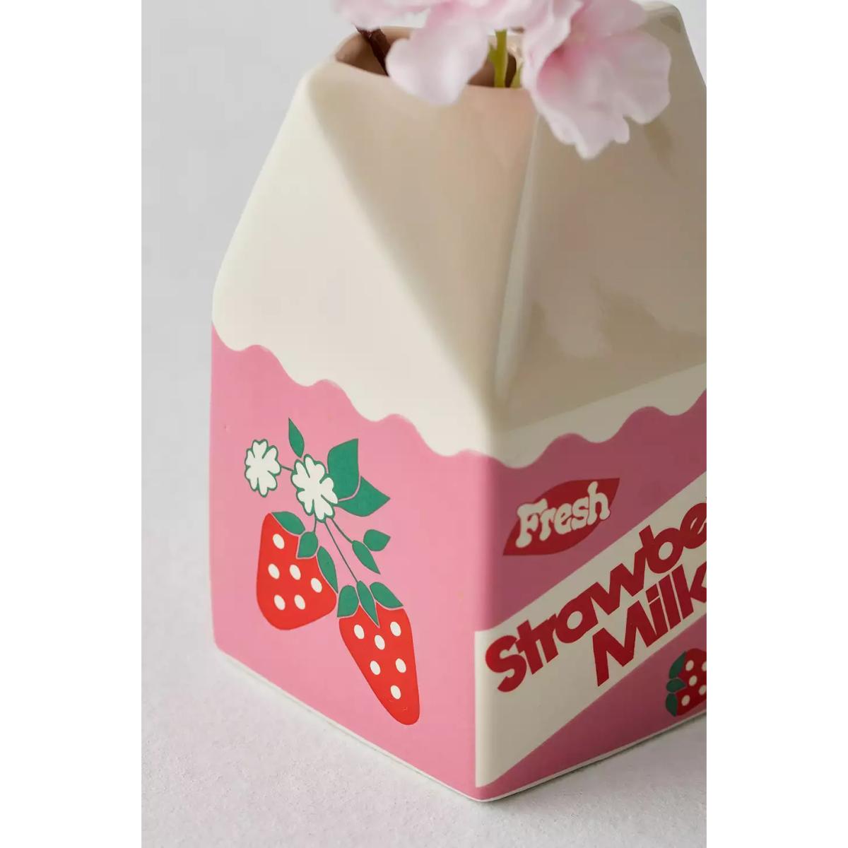 Kitsch strawberry milk vase by ban.do. The square-base ceramic vase offers a cute design with printed strawberry milk designs and a hole at the top for positioning tall plants inside. **Content + Care** \- Ceramic \- Wipe clean