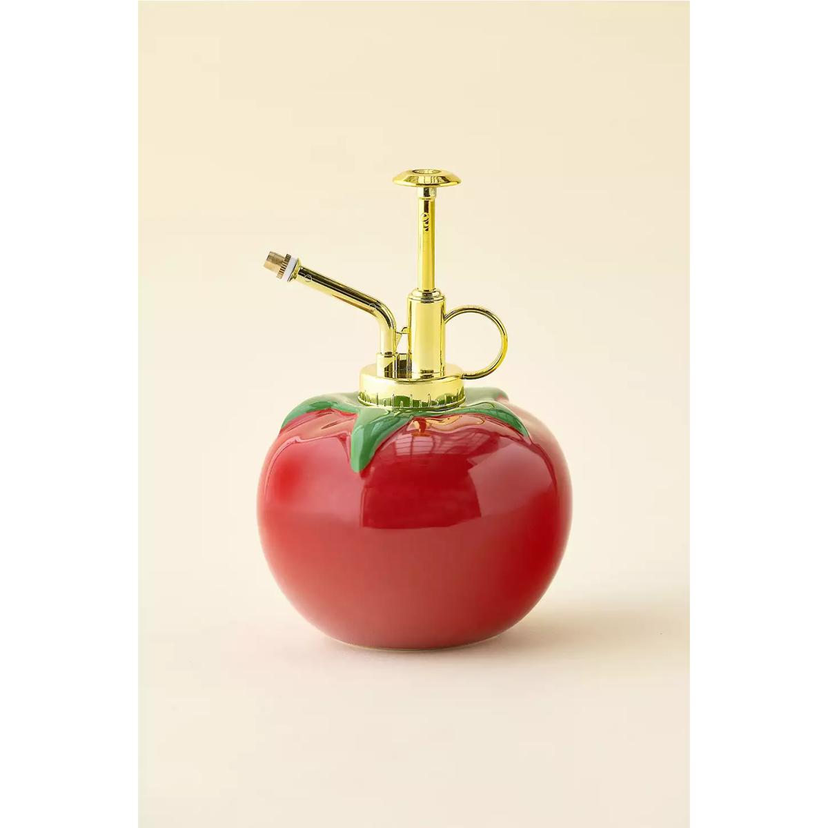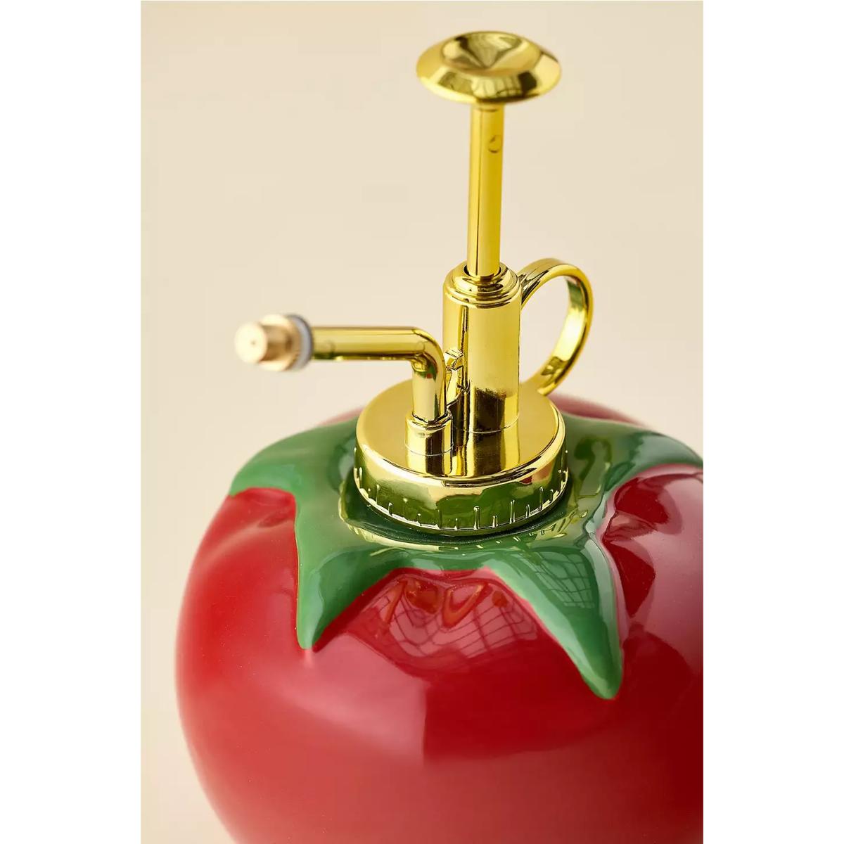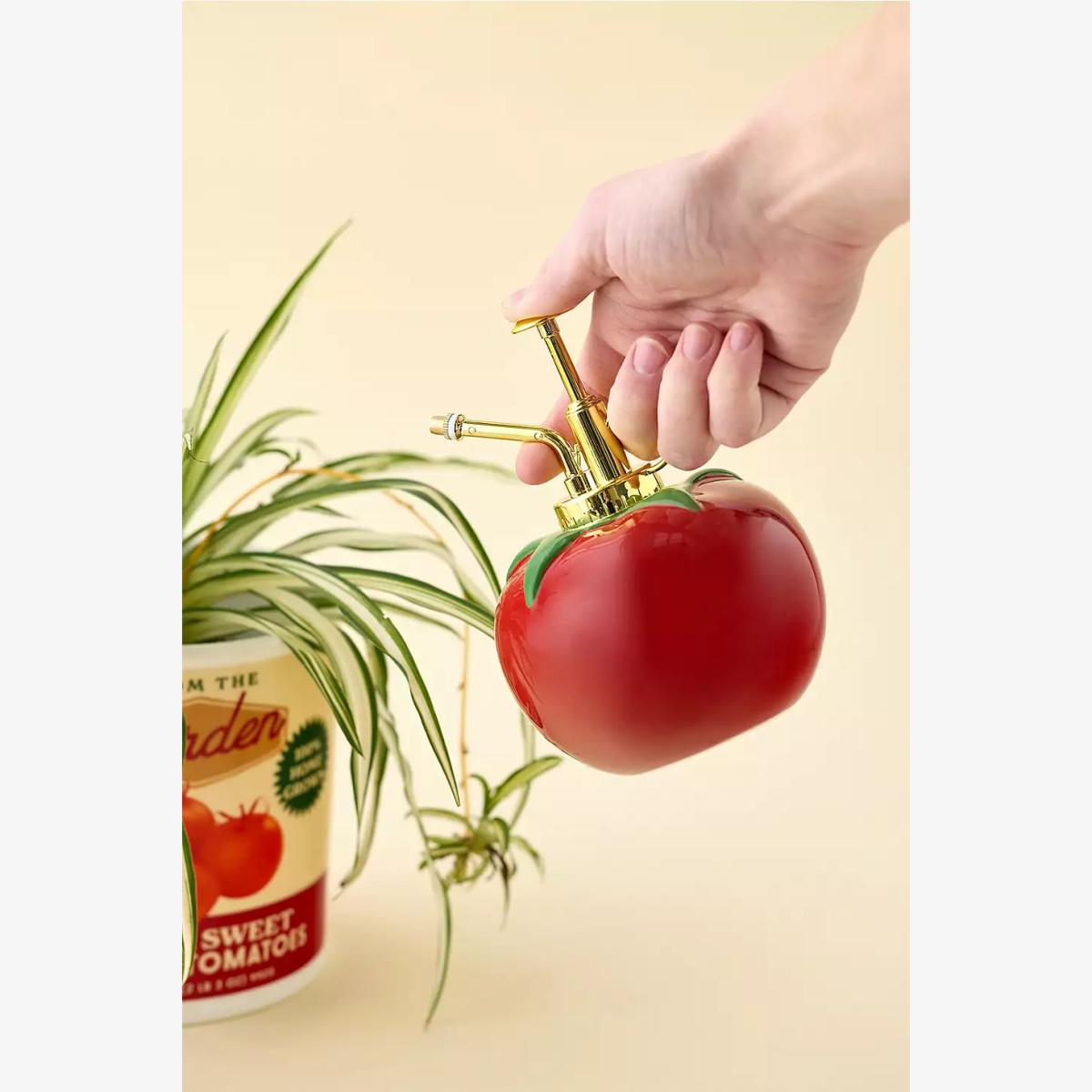 Whimsical tomato-shaped plant mister from ban.do with a vibrant red design and green leaf accents. Features a golden spray nozzle and pump mechanism for easy spritzing. Perfect for nurturing plants while adding a playful touch to your space. **Content + Care** \- Ceramic \- Wipe clean