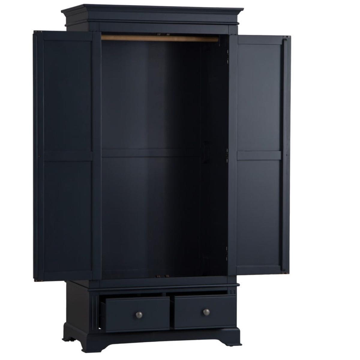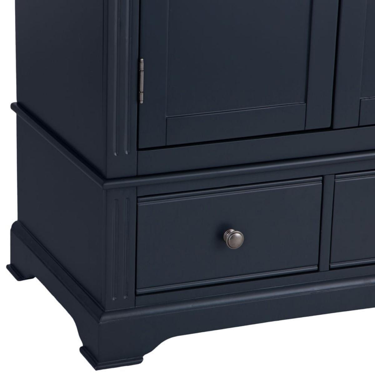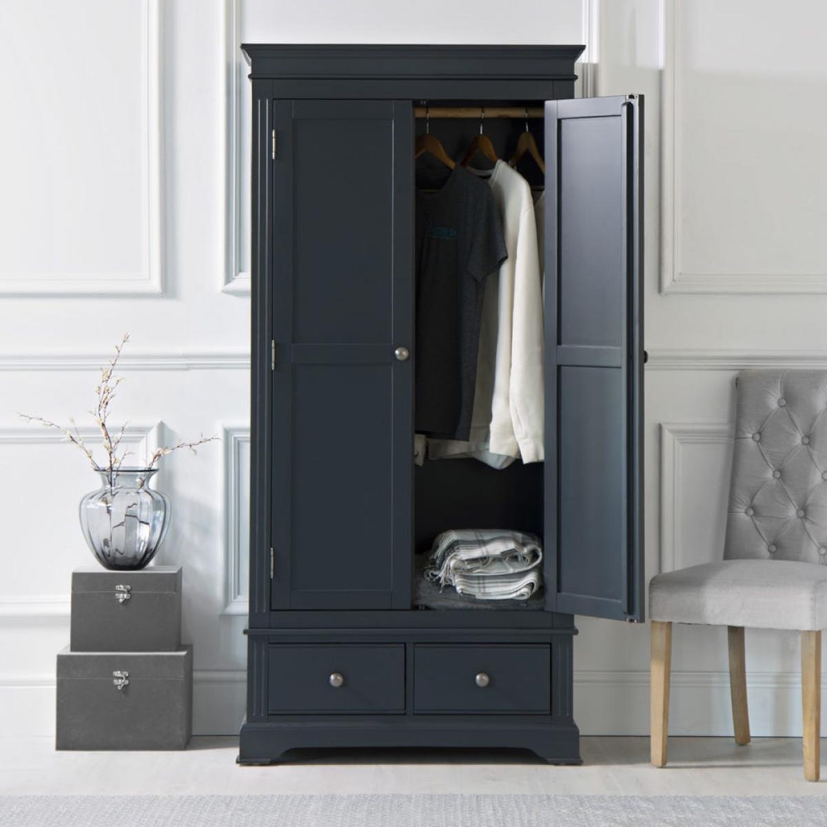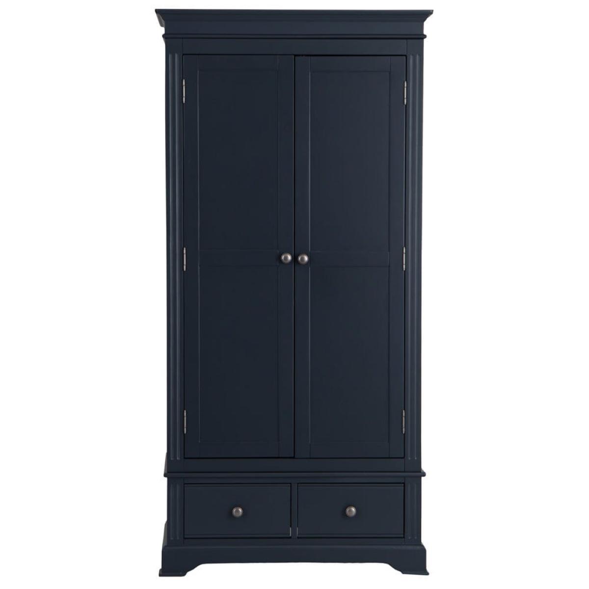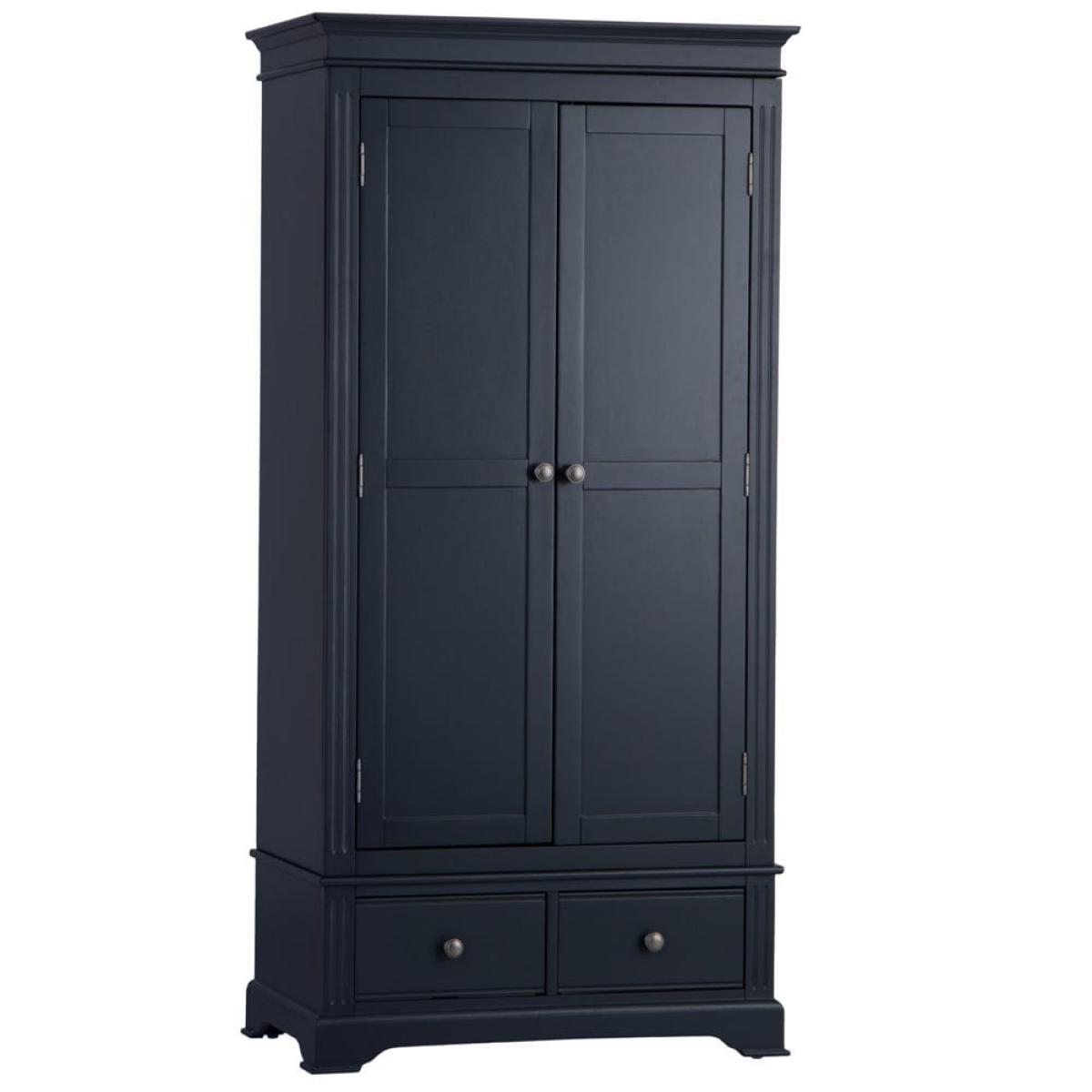 Bring the peace and serenity of a cloudless starry night into your bedroom with the Banbury midnight grey painted 2 door wardrobe with drawers. The elegant cornice detailing across its top surfaces and ornate wooden panelling add a touch of artisan sophistication to any bedroom. It’s offset by classy round pewter handles that tie the whole look together. Hang your best glad rags behind the wardrobe’s gorgeous midnight grey painted doors. And the roomy drawers are perfect for storing an extra blanket or two for wrapping up warm on a chilly winter’s evening.