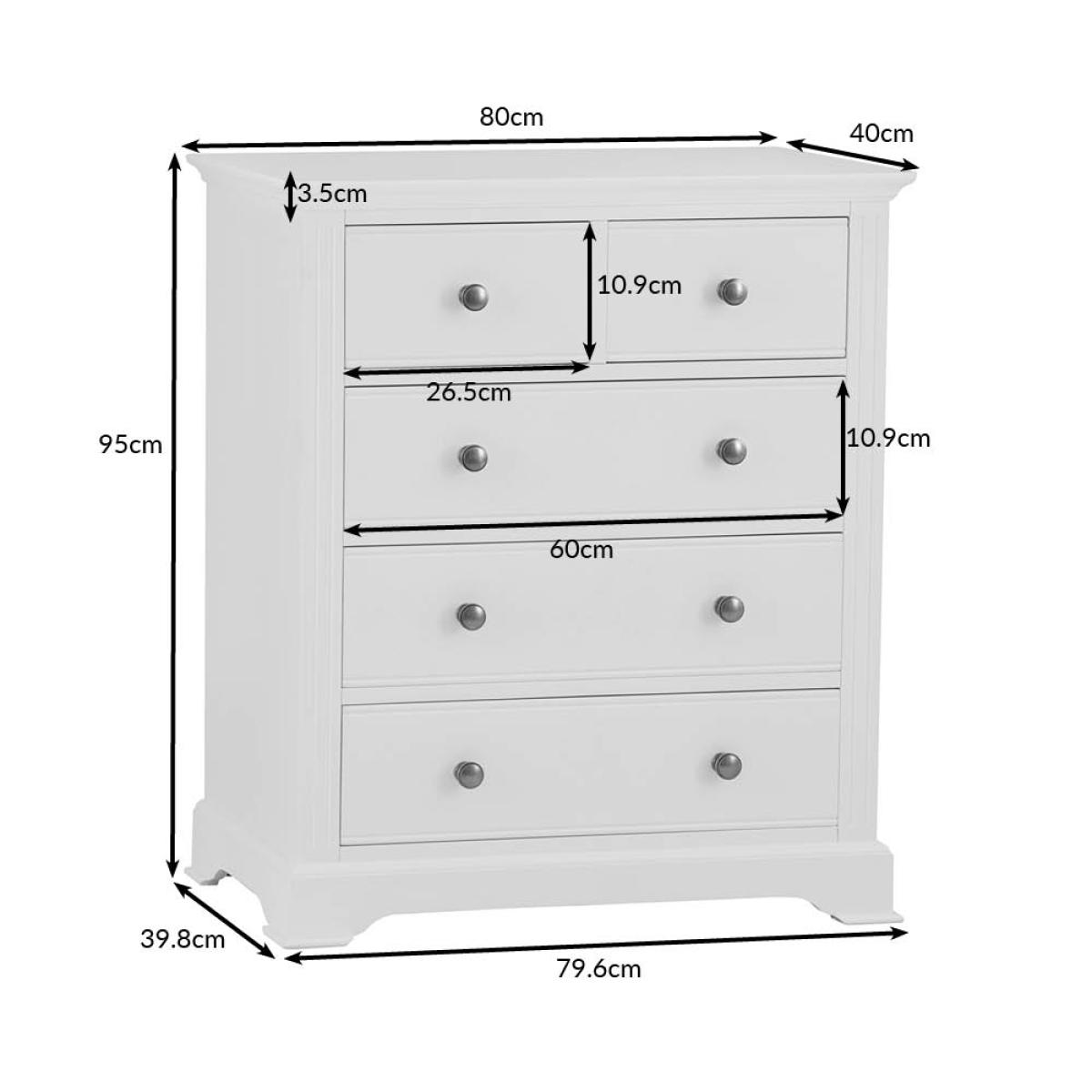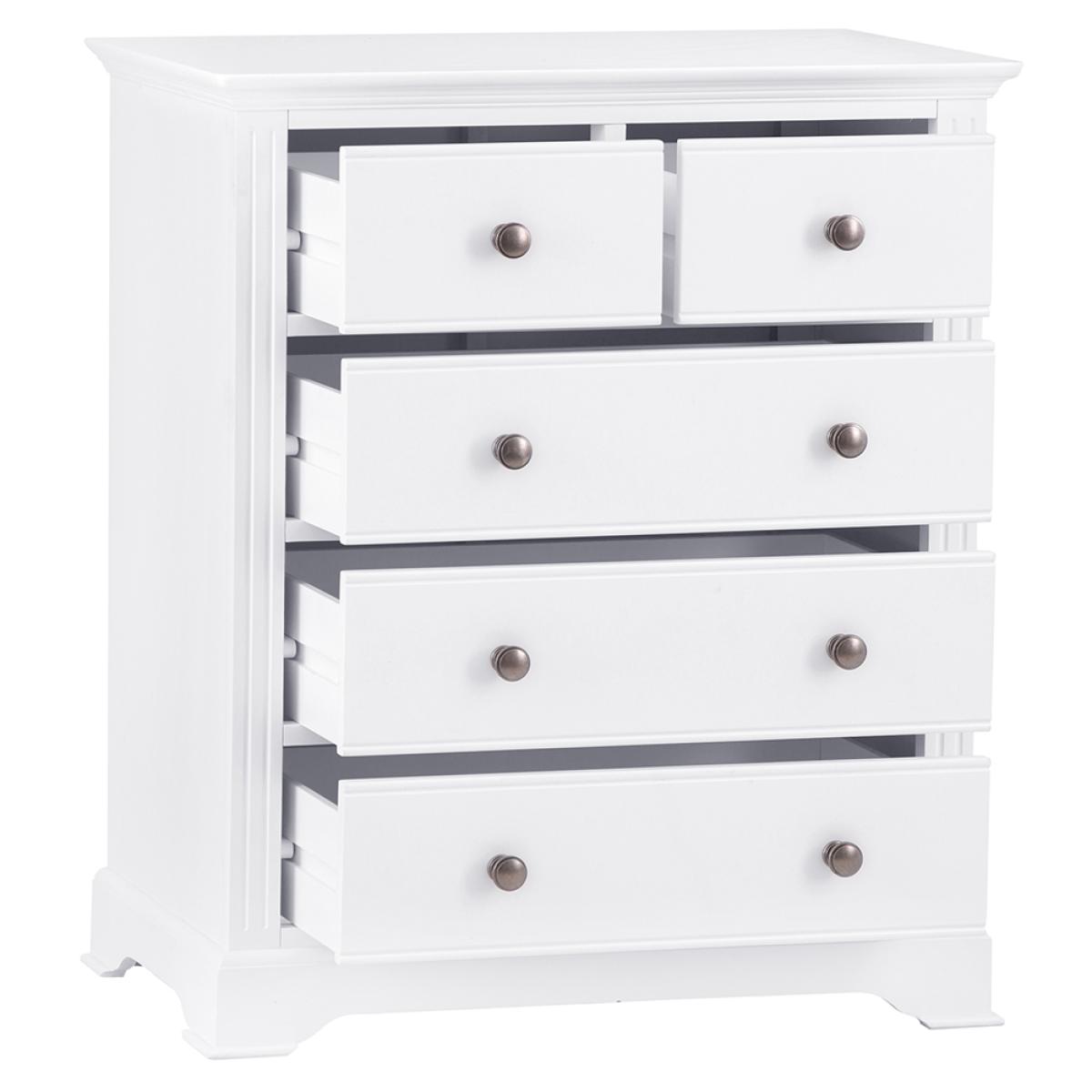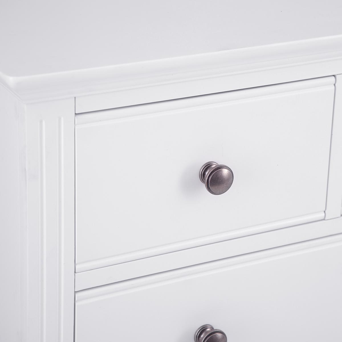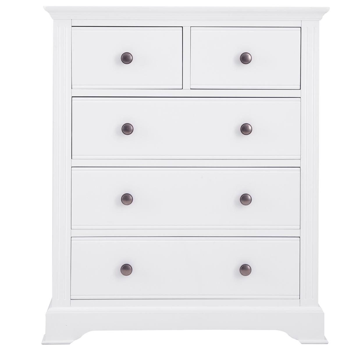 Transform the bedroom in an instant with a little help from this eye-catching 2 Over 3 Chest of Drawers. With a pair of smaller drawers sitting atop a trio of large storage drawers you’ll have more than enough room for your favourite outfits and accesso-ries. When you’re deciding on how to style the rest of the room, it’s worth remember-ing that the subtle interplay of the pewter-style handles and cornice detailing make this a set of drawers that works everywhere from modern homes to period properties. Just what you need when you want to breathe new life into your favourite room in the house.