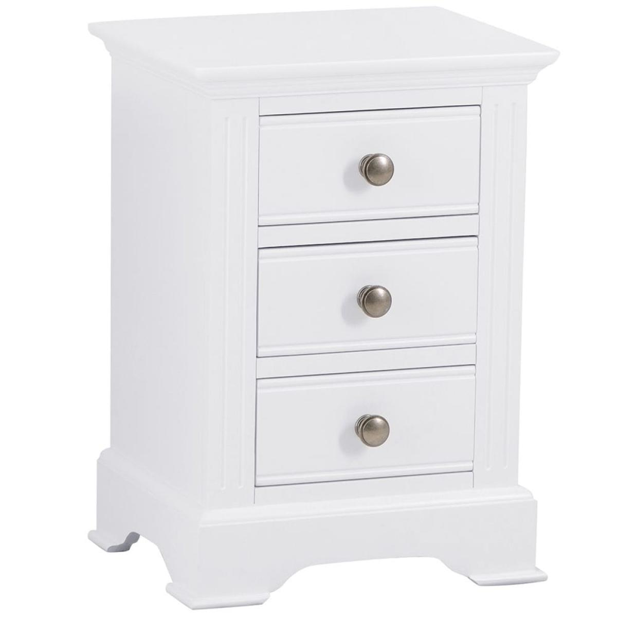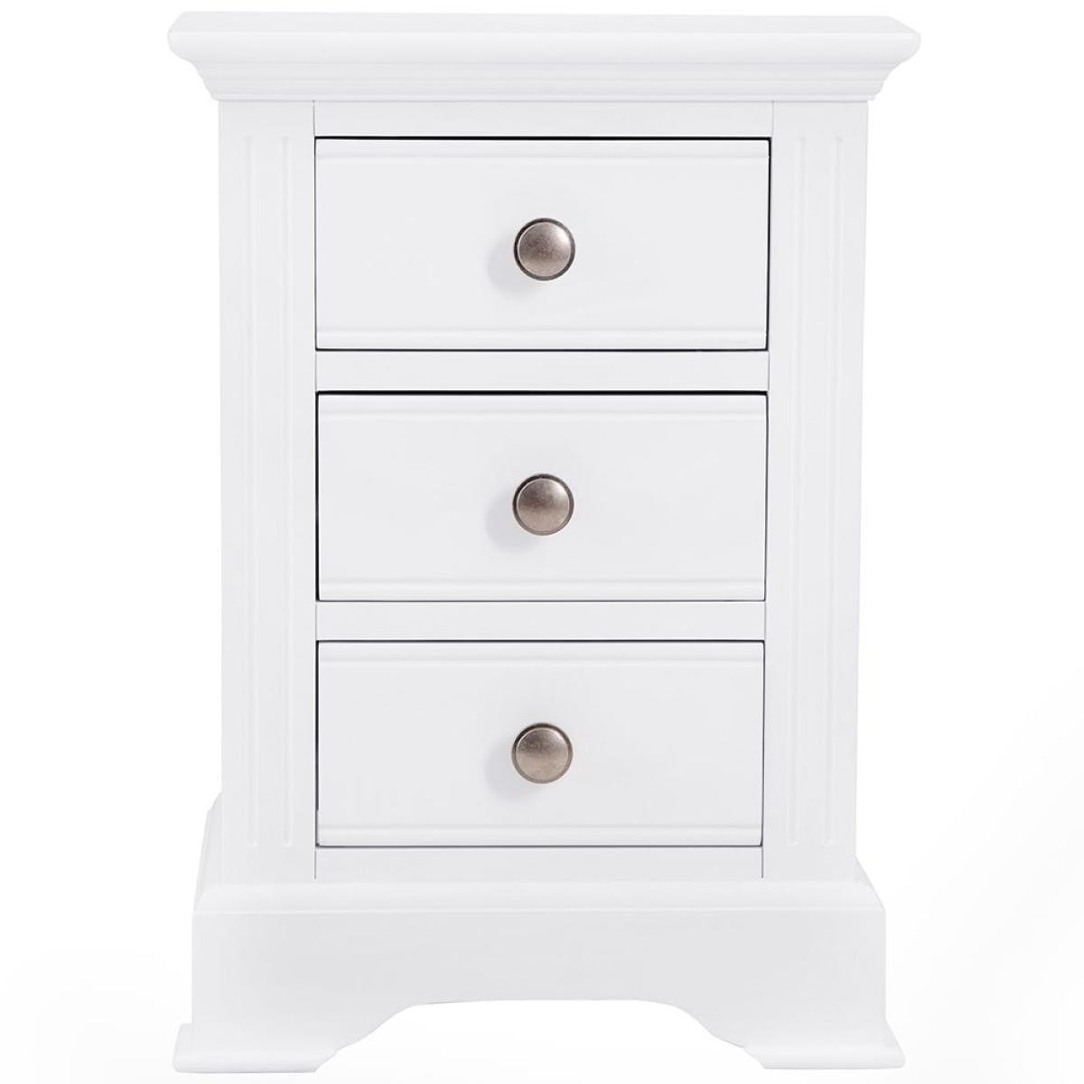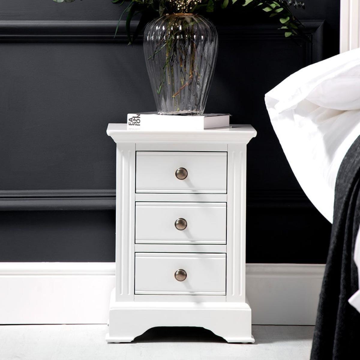 This Banbury white painted large bedside table isa great spot for a cosy reading lamp and your latest page-turner. The smooth solid pine top is surrounded by ornate engraved edges, and the three roomy drawers feature round pewter-effect handles. The subtle panels on the frame and drawers lend this item both texture and timeless charm. Use the drawers to store all your valuables and treasured possessions – or for even more reading material. Finished in our crisp Banbury white, this bedside table will blend beautifully into any colour scheme.