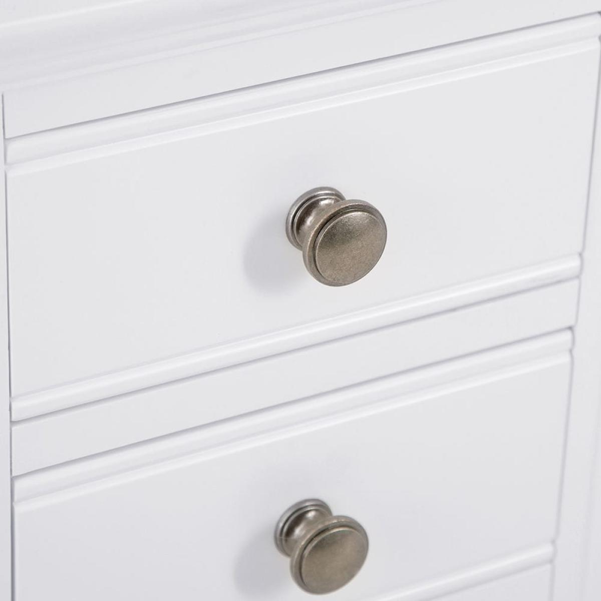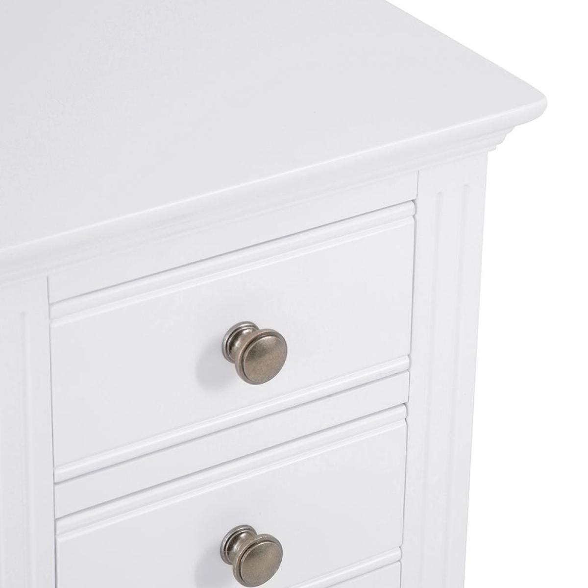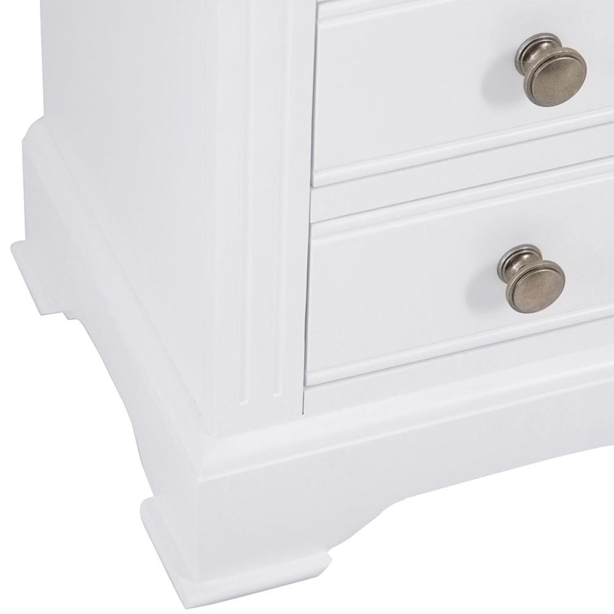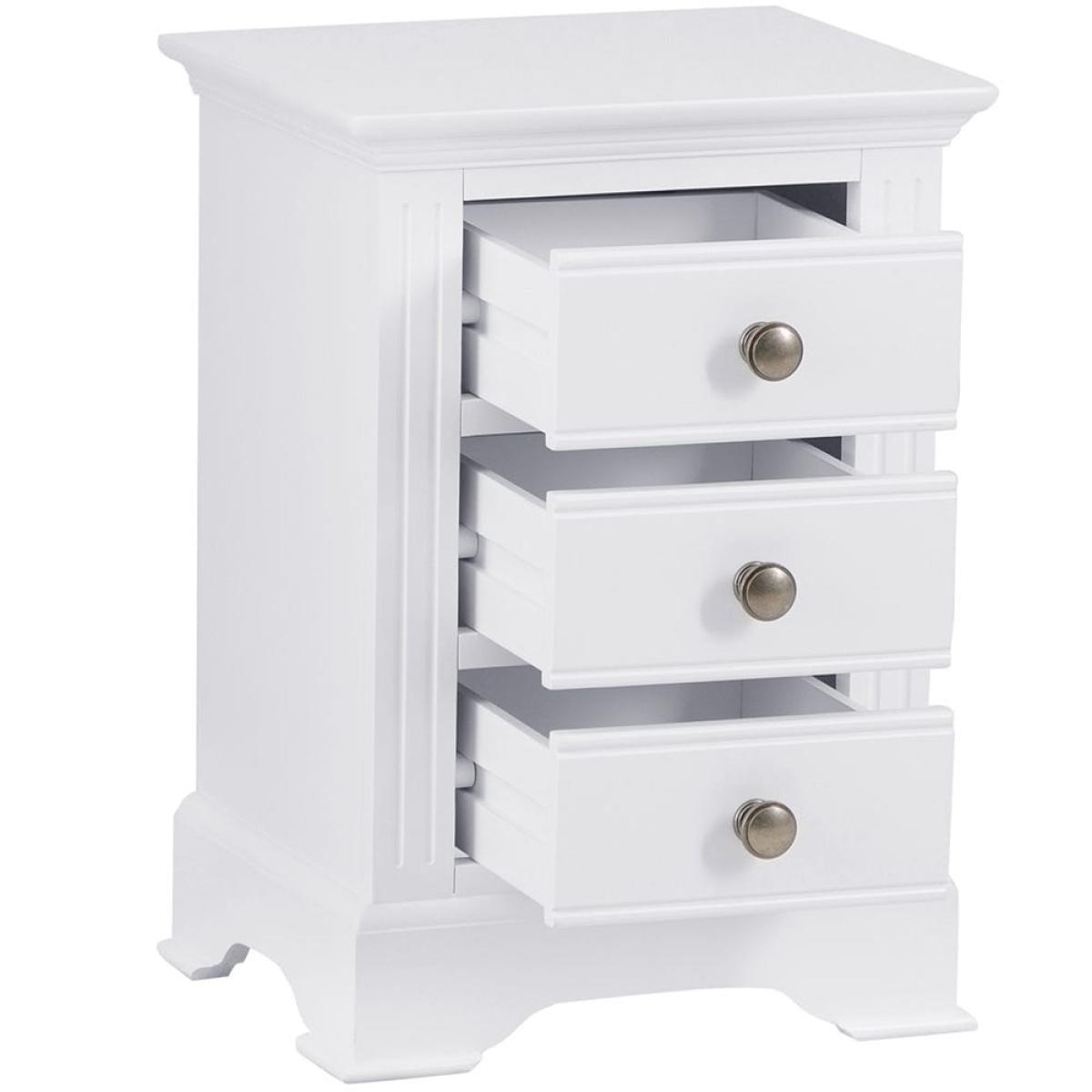 This Banbury white painted large bedside table isa great spot for a cosy reading lamp and your latest page-turner. The smooth solid pine top is surrounded by ornate engraved edges, and the three roomy drawers feature round pewter-effect handles. The subtle panels on the frame and drawers lend this item both texture and timeless charm. Use the drawers to store all your valuables and treasured possessions – or for even more reading material. Finished in our crisp Banbury white, this bedside table will blend beautifully into any colour scheme.