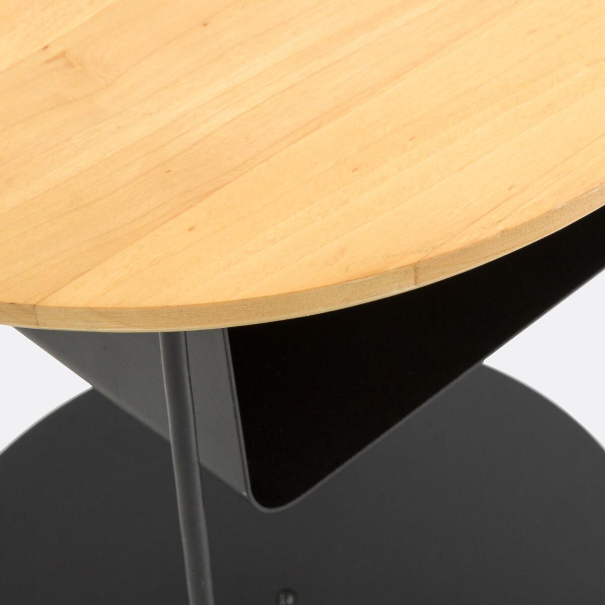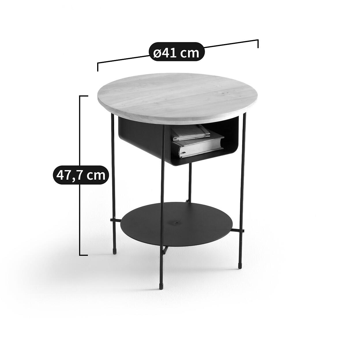 Bangor metal and birch wood bedside table. Perfect as a side table or bedside table. Product Details • 1 round tabletop • 1 compartment + 1 shelf • Solid birch top • Structure, compartment, shelf and base in epoxy-finish steelDimensions. Total: • Diameter: 41cm • Height: 47.7cm. Usable dimensions: • Compartment: L21.5 x D24.5 x H12.5cm • Lower level and shelf: Diameter 30cm. Dimensions and weight of parcel: • 1 parcel • L58 x D47 x H20cm, 7.5kg