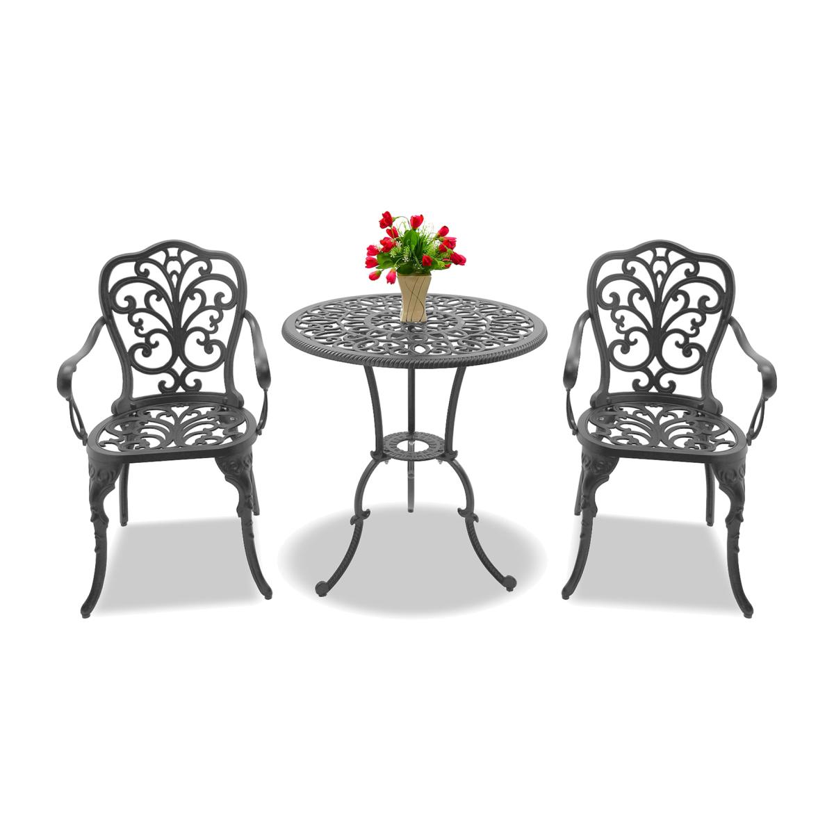 With its lavish design, the Bangui bistro set is both practical and convenient, and perfect for maximising any space. It promotes a Spanish influenced design, with intricately patterned chairs, detailed floral table top, and stylish legs. It comes complete with a central hole for the placement of an umbrella or parasol with a diameter of 4.5cm. Made from no-rust cast aluminium, the Bangui garden bistro set is strong yet lighter and easier to move than the traditional cast iron predecessor. It is low maintenance, and easy to keep clean, powder coated in black and complete with rubber feet for steadiness. With durability in mind, the hardwearing Bangui cast aluminium bistro set is designed to be left outside all year and resistant to most types of extreme weather.