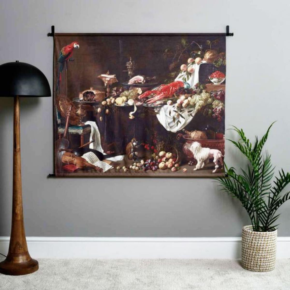 The Banquet Table Wall Hanging is large piece of art work and a grand imposing image that will wow your visitors and family. Featuring a reproduced paintint of a fine banquet, the wall hanging is made of a polyester velvet fabric and is supported by two batons at the top and bottom. The hanging attaches to the wall via two simple hook brackets included.