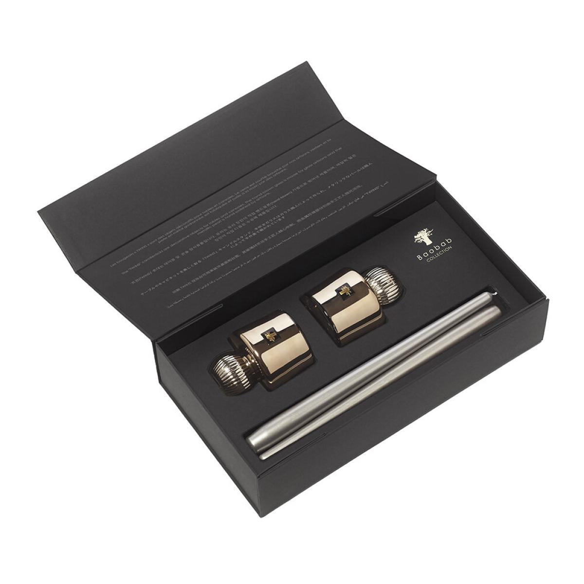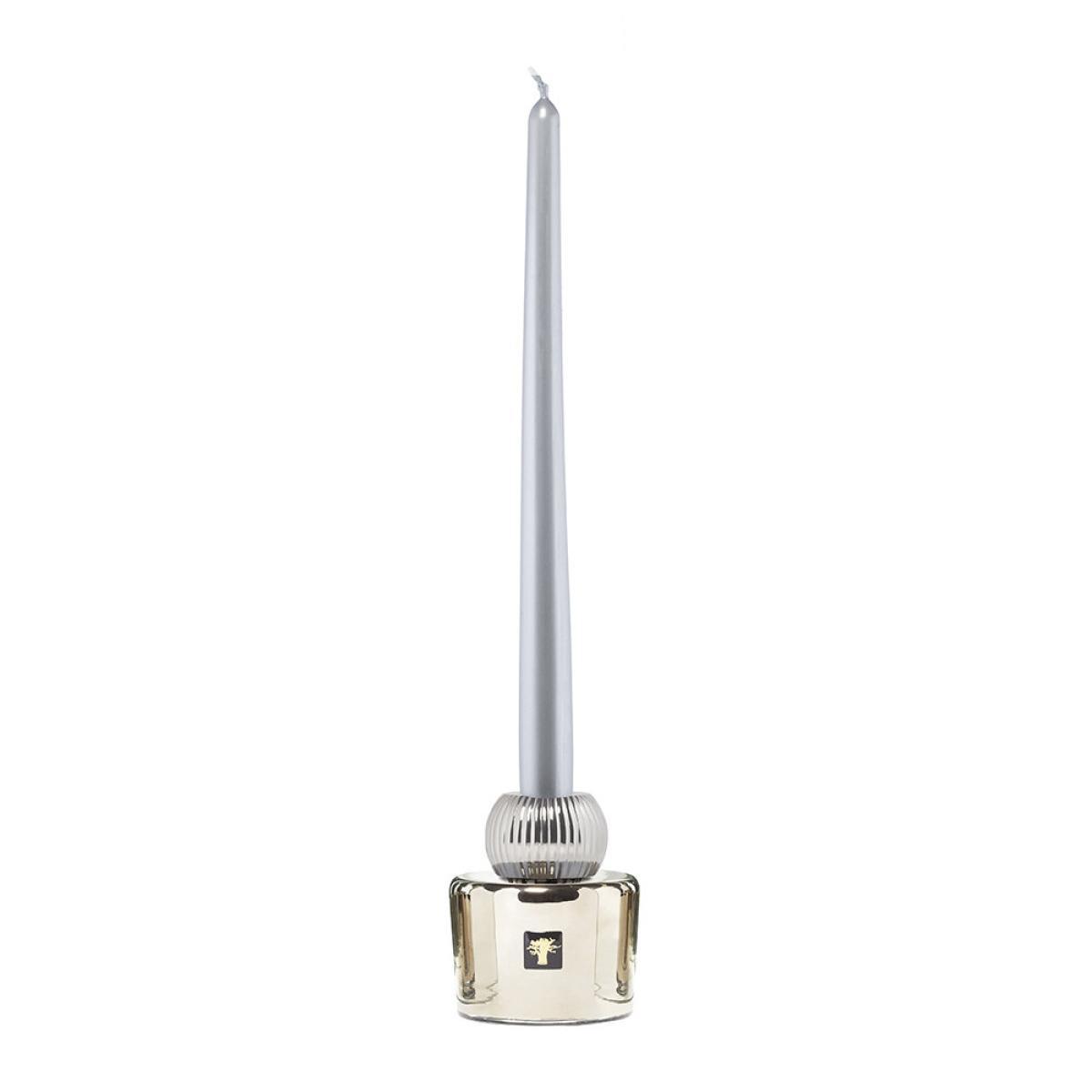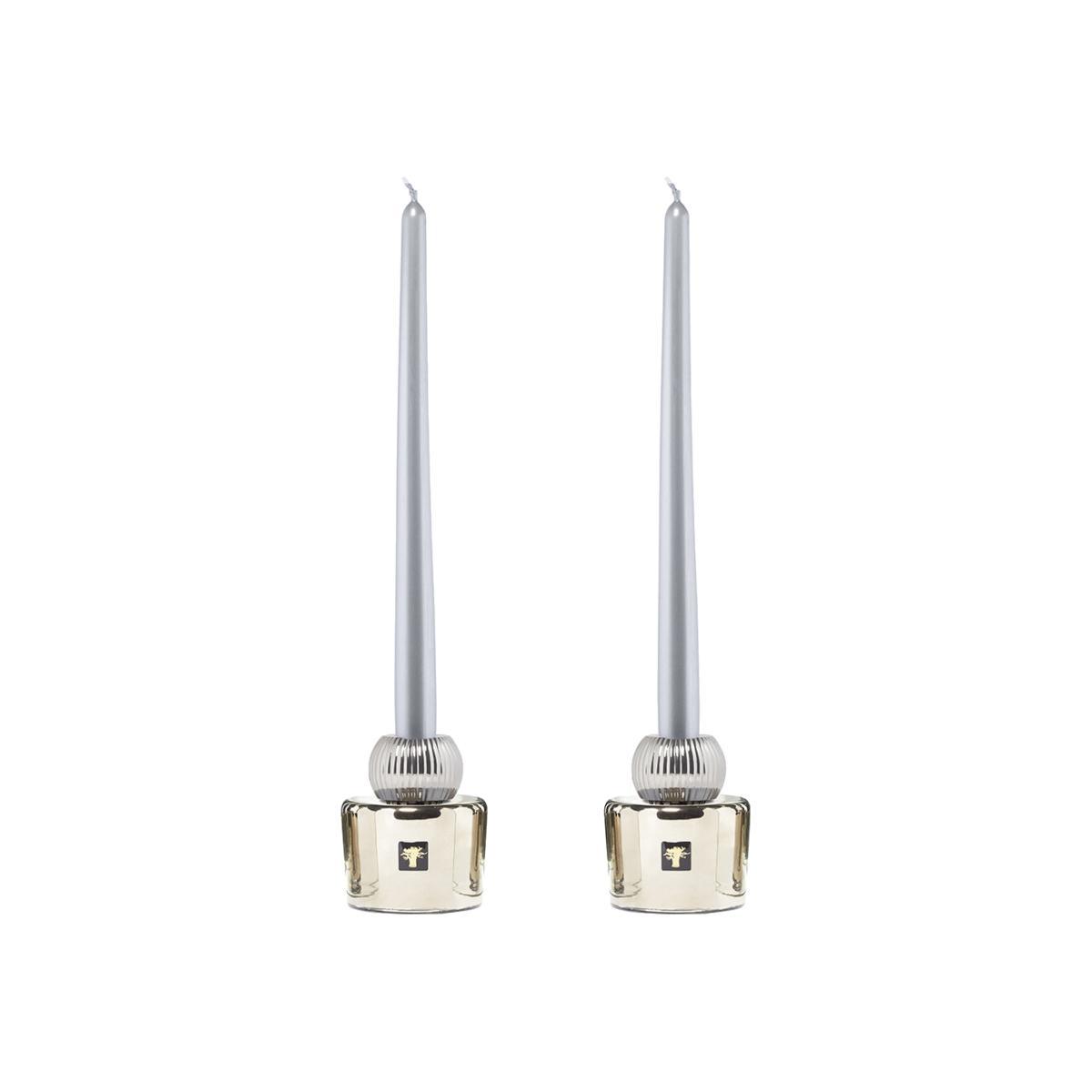 Bask in the glow of your dinner table with this Les Exclusives Twins set of two candle holders from Baobab Collection. In shining silver and gold shades, these candle holders are inspired but the luxurious Les Exclusives scented candles. With mouth-blown glass bases topped with an embossed metal ball, they’re finished with two tapered candles.