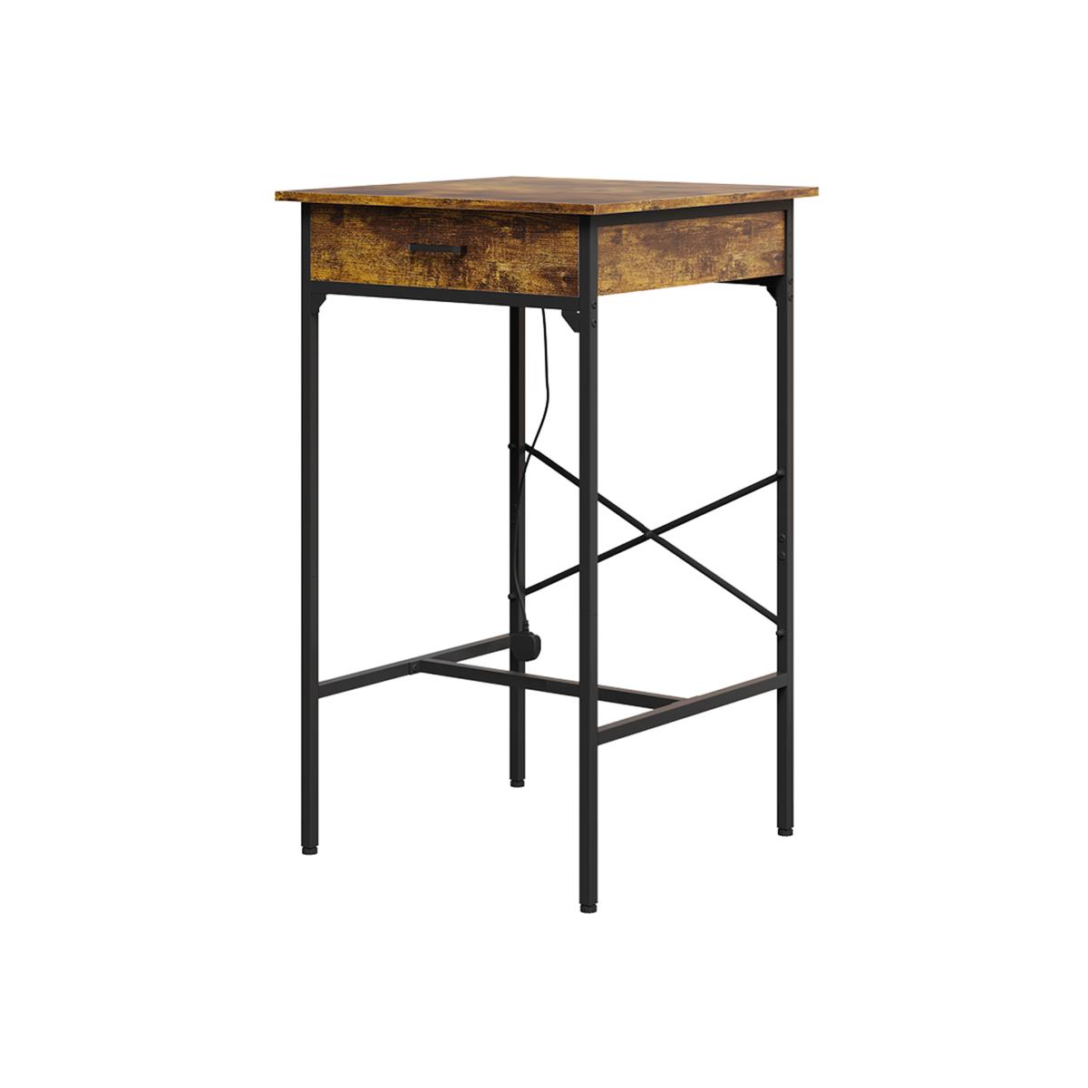 This rustic style bar table combines clean lines with modern convenience thanks to its built-in charging station. The natural wood grain finish adds warmth and character to any room. A single drawer with a black handle provides discreet storage for everyday items, while the integrated charging unit featuring two AC sockets and two USB ports keeps your phone, tablet, and other devices powered with ease. More than a compact charging table, it also works well as a side table or sofa side console, making it a versatile addition to the bedroom, living room, or home office