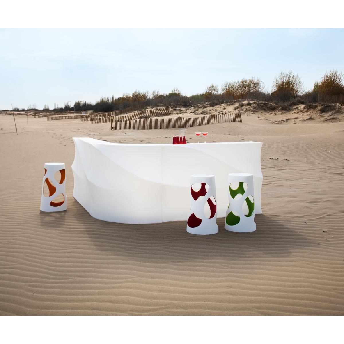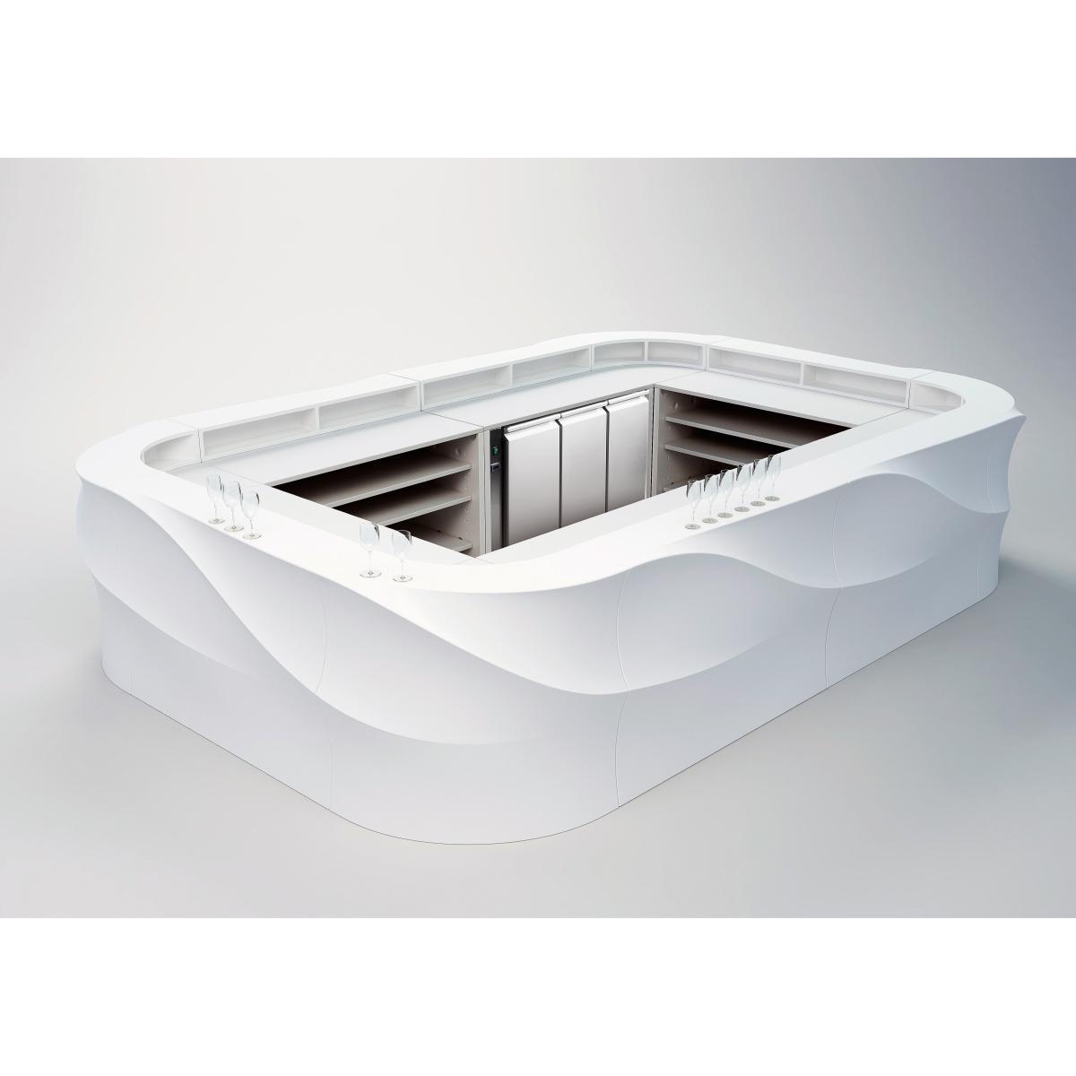 A revolutionary bar counter for outside to be easily turned into a perfect and convenient fixed counter for interiors. A unit structure designed to be professionally used, but flexible enough to be used elsewhere, from the most simple to the most complex configuration. An essential and elegant design, to be rapidly customized at ease. A foldable structure to cut in half any transportation and storage required space. And it is so innovating, the Baraonda Myyoour counter, that it is difficult to place in a specific category, as it creates a brand new one: the "Italian different concept" in its best expression. Two types of front units (bent 1 x 1 m and straight 1. 60 m), unit side panels in two different depths, set to easily fit in any electrical appliances. What is more additional spaces and the possibility to fit a raised board, essential for a convenient and ideal working height inside and as a support outside. Working tops in three different sizes (narrow 300 mm, performing 600 and 900 mm) in waterproof wood to allow to easily customize it. Different optional attachments available, among which a cocktail station in printed and reinforced abs, a professional and ergonomic workstation to comply with the more expert bartender requirements, fittings to rapidly connect to the water and electric wiring, adjustable feet, optional castors, drilling fitting points to rapidly connect more counters and as an exclusive optional, an extremely sophisticated lighting led system: rgt technology with many light and colour change effects, fed by a unique socket. An installation which can be synchronized more with more complex light station, as used in a disco. Finally a counter which can comply with any requirement, so flexible to be used, in its essential configuration, as a reception desk too. And finally its quality stands out: incredibly easy to clean and long-lasting thanks to the use of Polyeasy, the revolutionary plastic material exclusive used for all Myyour products.
